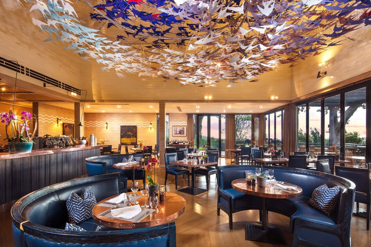Enjoy every moment of exquisitely balanced Asian-influenced flavours in their intimate setting. Inside, a vibrant blue and copper colour palette creates a calming backdrop. Dine under the stunning Swallows in Flight art installation, sculpted by Lionel Smit and Andre Stead, where over 1000 swallows become part of the incredible views that stretch across Table Mountain.