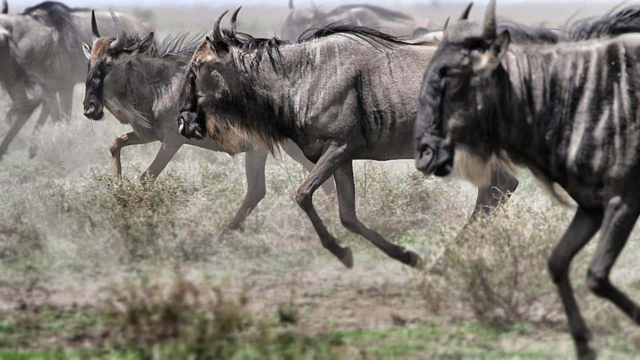 Dramatic savannah storms sweep in nourishment and new life, and an innate primordial urge pulls the wildebeest to the site of their origins to reproduce. The plains come to life for the birthing season. Millions of wildebeest and zebra dominate the landscape, looking for the fresh green grass that follows the first rains and to give birth to their young.