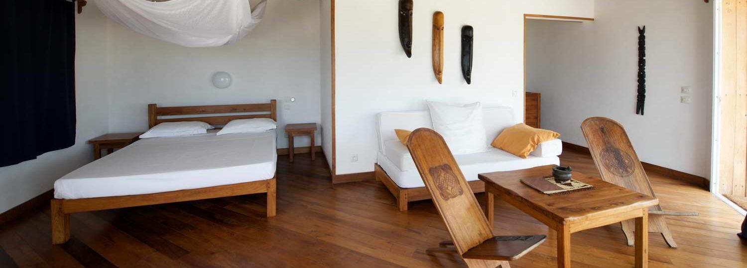 The interior design is simple and clean, with rosewood finishes. A precious parquet floor, naturally smoothed with coconut shells (thanks to a typical Madagascar tradition that recalls a primitive dance) gives the room a warm and welcoming tone. The front part of the bungalow is in the continuation of the living room, with a comfortable sofa that can be converted into a third bed. A small hallway connects to the bathroom with shower.