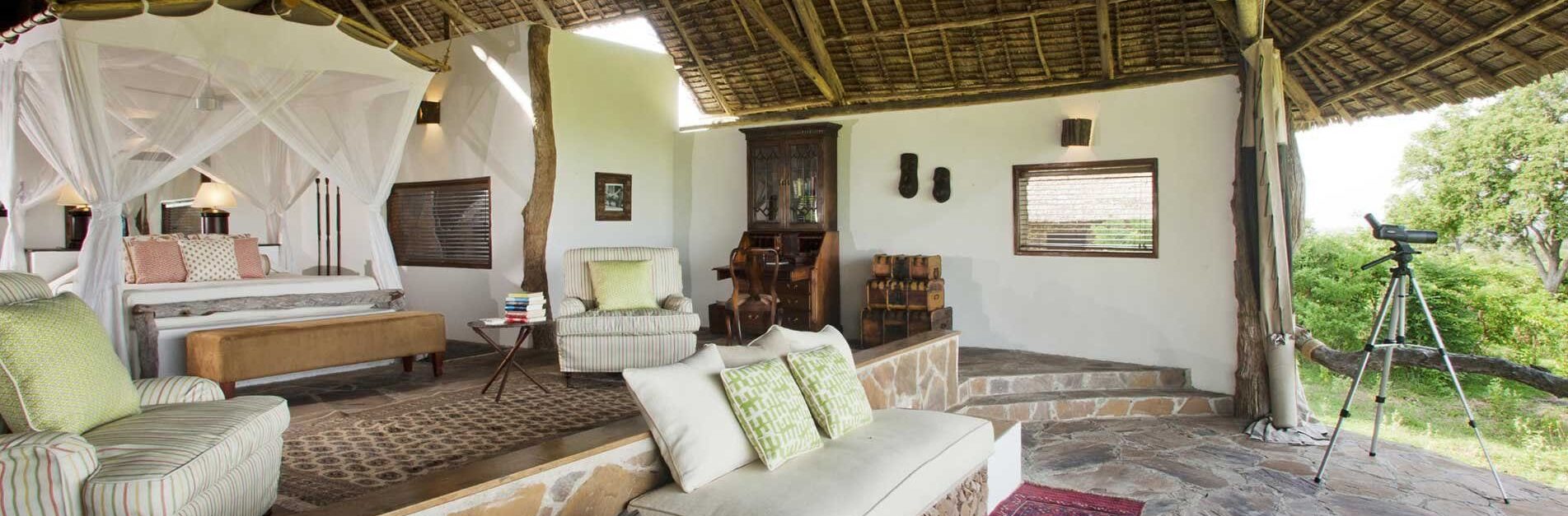 There are just eight spacious stone ‘bandas’ at Beho Beho. All are furnished with king-sized beds, huge comfy chairs, Zanzibari day beds, ceiling fan and old writing desks. The front of the banda is open and extends onto a spacious veranda, from where there are superb views over the surrounding bush. Each banda has a separate dressing room leading to an en suite bathroom with twin basins and an open air shower. There’s also a private suite which comes with its own private vehicle and guide.