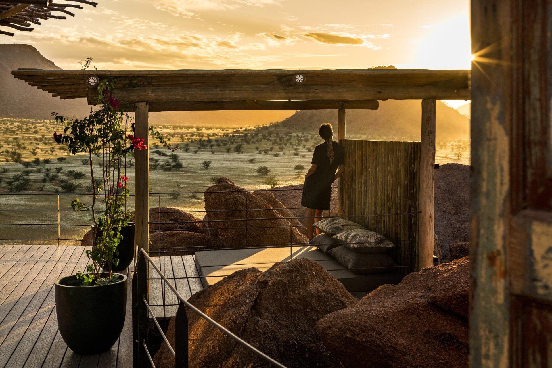 Organic and understated, the rooms at Camp Kipwe are like extensions of the rocks themselves. Inside the dome shaped space, you feel like you are entering a secluded cave, becoming one with the landscape. Natural touches β rocks embedded in the floor, animals carved into the wood, mimicking the area’s famous engravings β add to the unique sense of place found at Camp Kipwe. Nestled against the boulders, the partially open-air bathrooms provide a bit of whimsy in the bush, while a small deck extends the living space, connectingΒ youΒ to the dry riverbed and the views beyond. In all there are nine rooms at Camp Kipwe and one sprawling, thatched roof suite full of unexpected luxuries, surprising pops of colour and spectacular views.