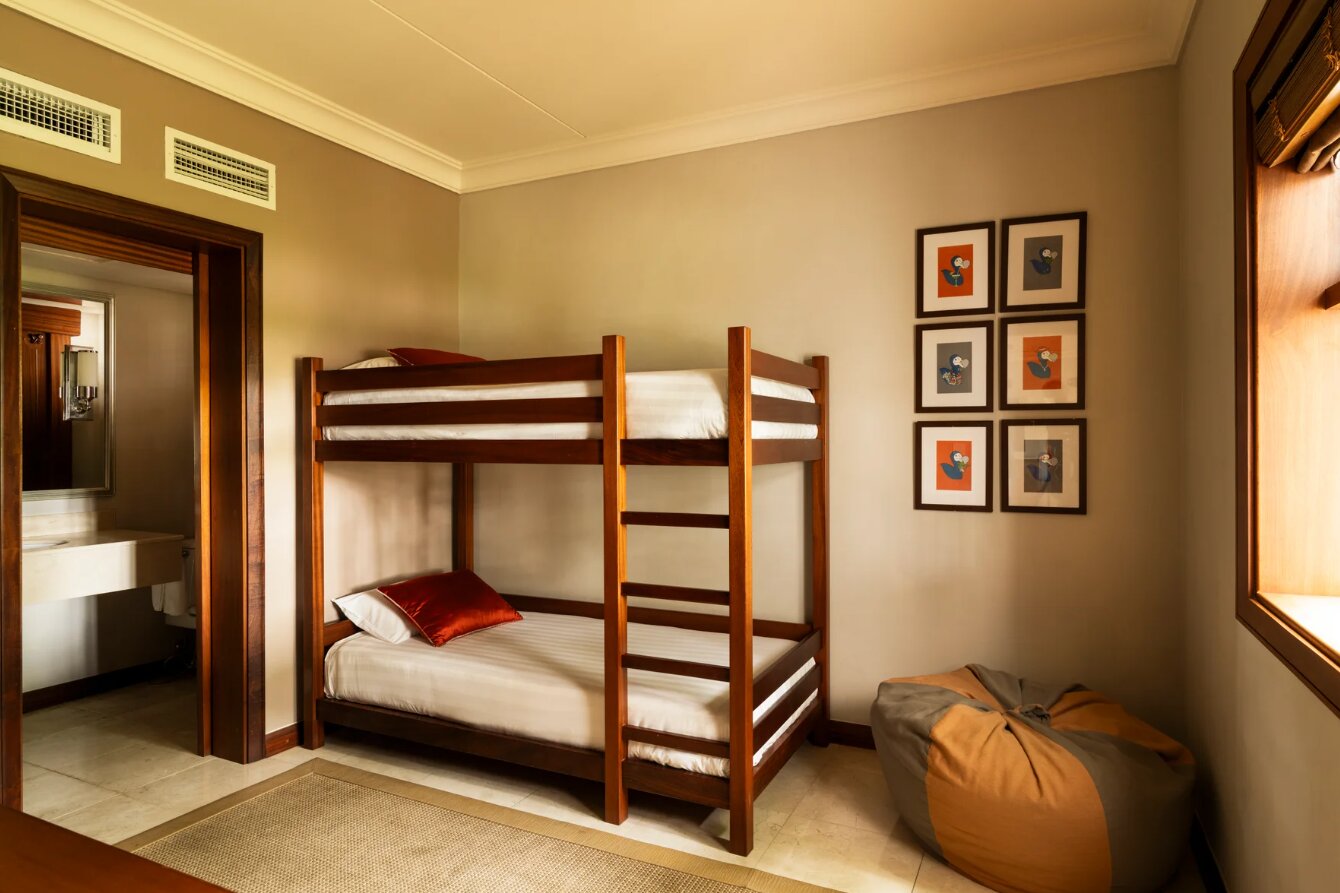 76 Junior Suites (70mΒ² in size) are a tranquil, refined blend of teak, granite and marble with massive wooden furniture unique to Le Prince Maurice. Eight of these are built on stilts over the natural lagoon; the others are on the beach or on in the gardens. 12 are family suites with a main bedroom and a second kids room with bunk beds. All air-conditioned suites have minibar, satellite TV, Apple Mac mini, wireless internet access, safe and telephone.