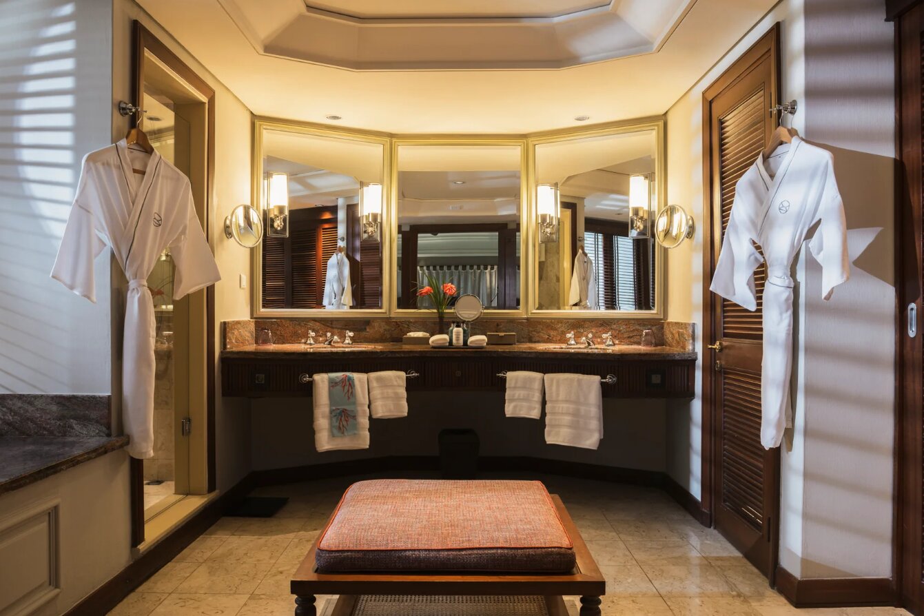 The 350mΒ² Princely Suite comprises two junior suites and one senior suite with two swimming pools. It’s located in a private part of the hotel grounds offering complete privacy and seclusion.