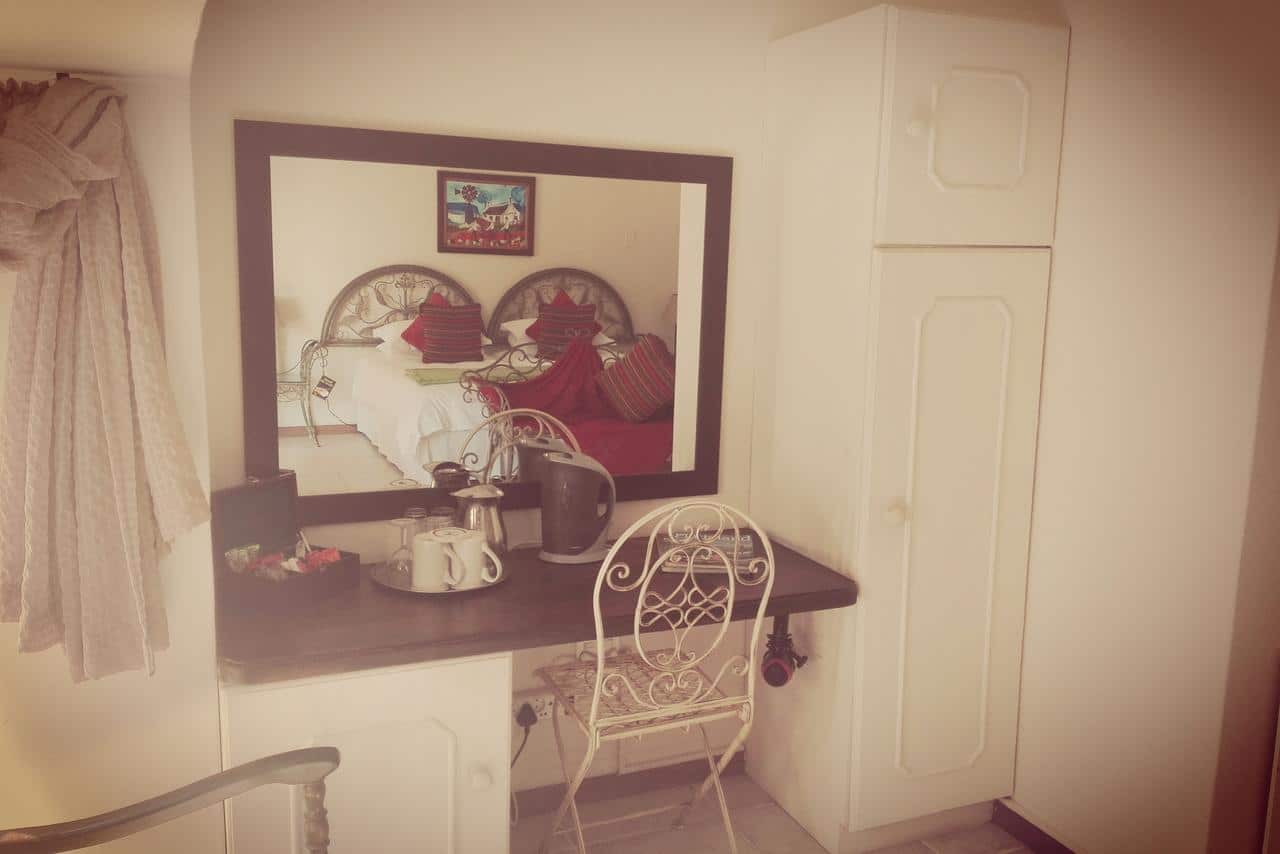 King size bed in a very spacious suite style room with full en-suite bathroom (victorian bath & shower). Fireplace, private outside entrance, porch & outside BBQ facility, air-con, DSTV, heaters, down duvet & pillows, stocked bar fridge, tea/coffee.
