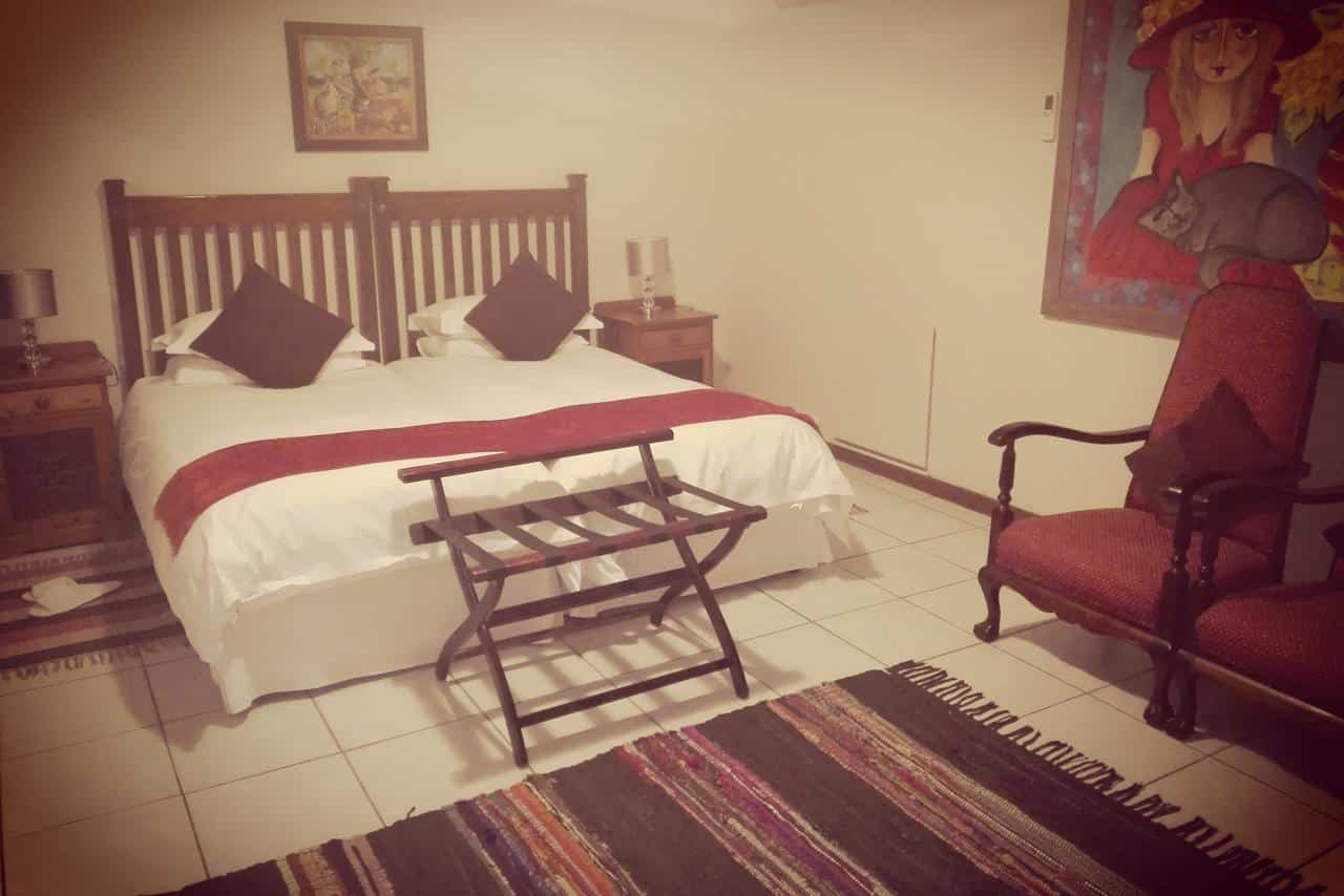 Spacious room decorated with original artwork, twin beds & en-suite bathroom with shower only. Private outside entrance & patio, air-conditioning, DSTV, heaters, down duvets & pillows, high quality white linen, stocked bar fridge, tea/coffee facilities.
