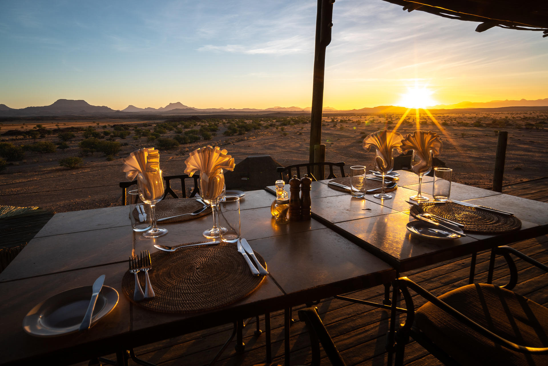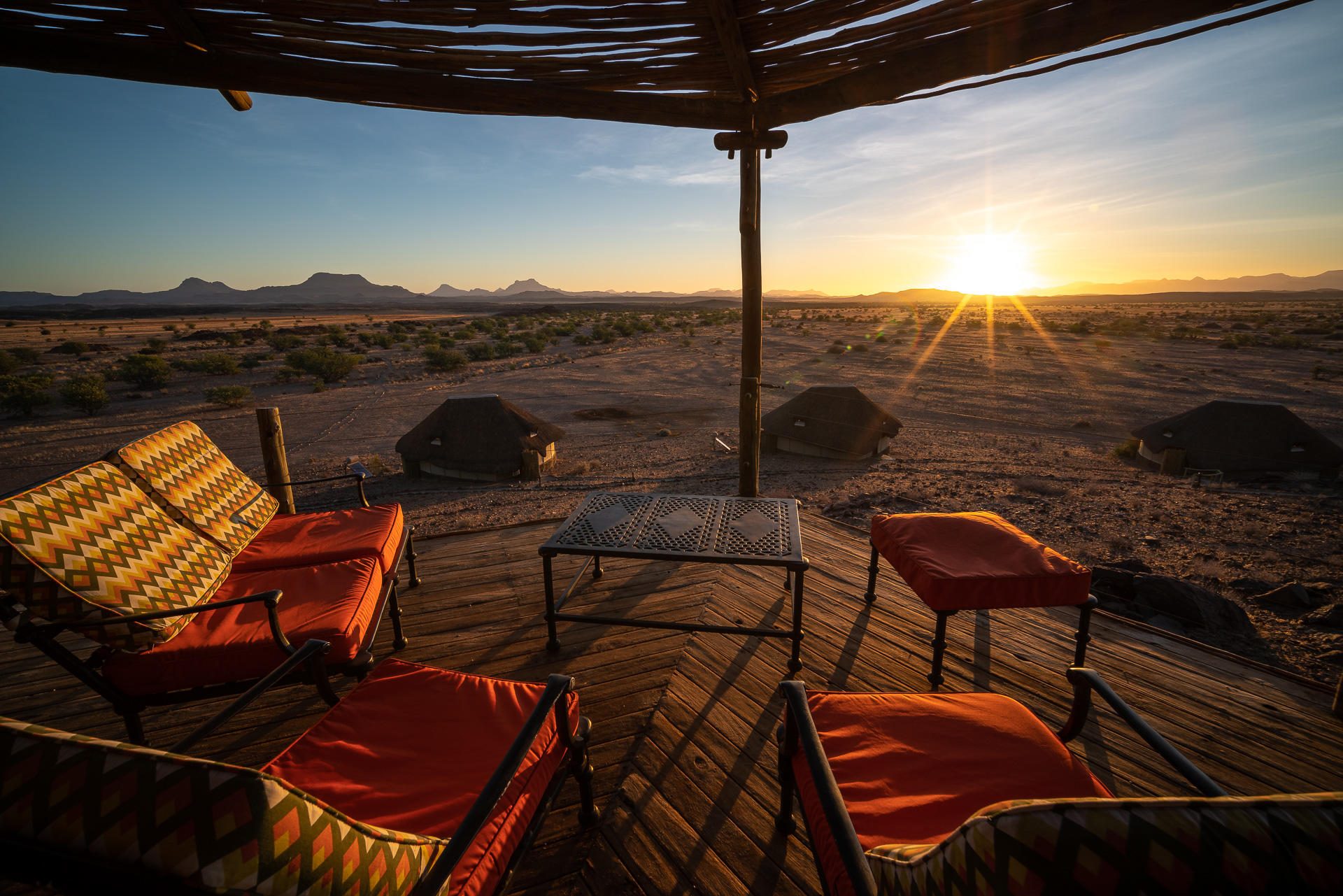 Wilderness Doro Nawas has 16 spacious chalets made of stone, canvas, wood and thatch. Each chalet has stunning panoramic views of the Etendeka plateau and the sandstone cliffs of nearby Twyfelfontein. Each has a spacious en suite bathroom and bedroom with floor to ceiling glass walls that open up completely onto your own private veranda with outdoor shower. The unusual roll-out beds mean you can opt to enjoy a sleepout under the Namibian stars on this raised deck.
