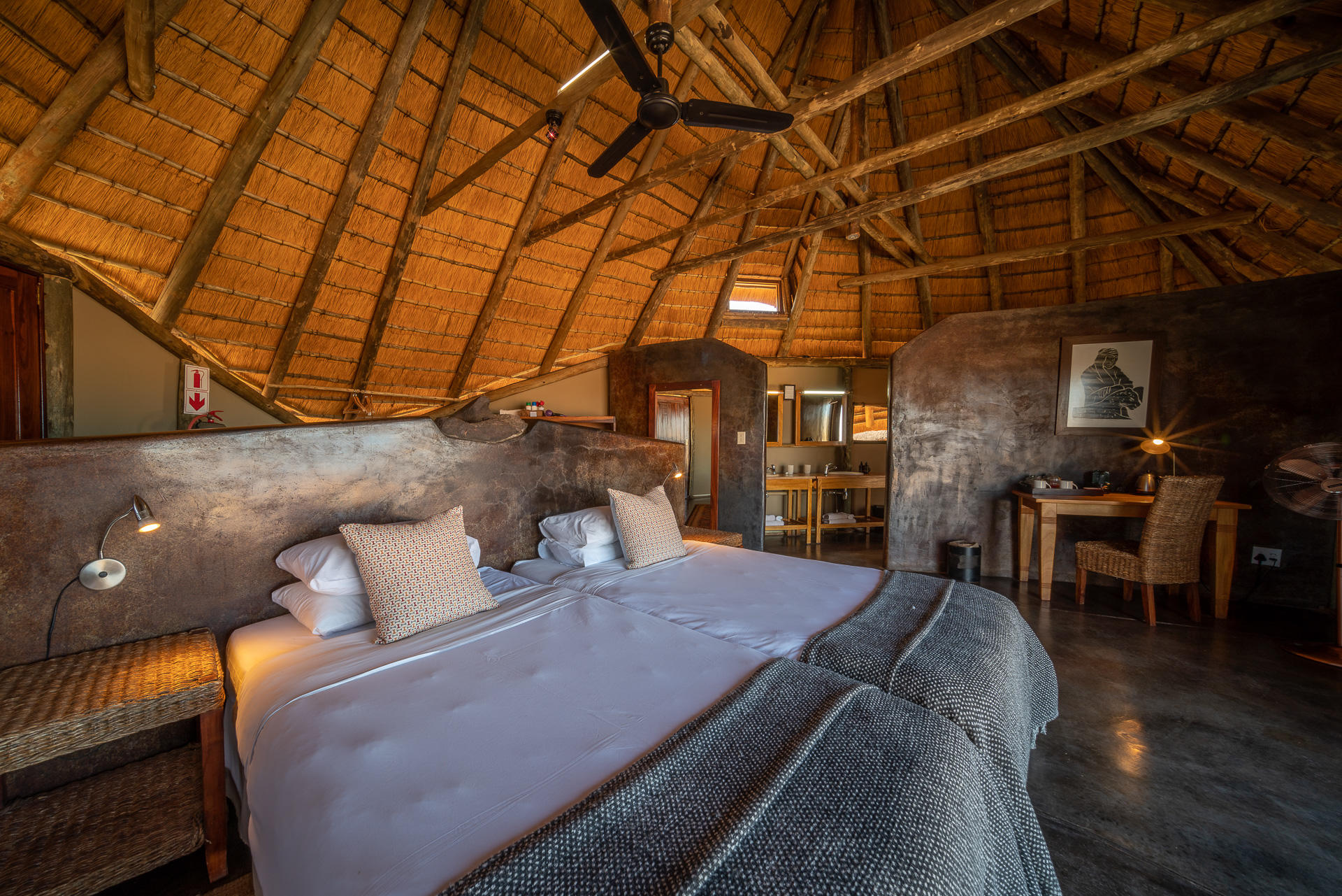 The unusual and slightly curious main lodge is perched on the rocky outcrop with commanding views of the spectacular Etendeka mountains to the north, the sandstone cliffs of Twfelfontein to the south and the plains of the dry river below. The design and dΓ©cor is unique to the surrounding Damaraland scenery. However it provides a cool refuge from the summer heat with both indoor and outdoor dining areas including a courtyard boma, as well as a sitting area, bar and small curio shop. Just below lies a pool deck with sun loungers. Upstairs the rooftop deck offers 360 degree views over the valley β perfect for relaxing sundowners or perhaps a spot of star gazing.