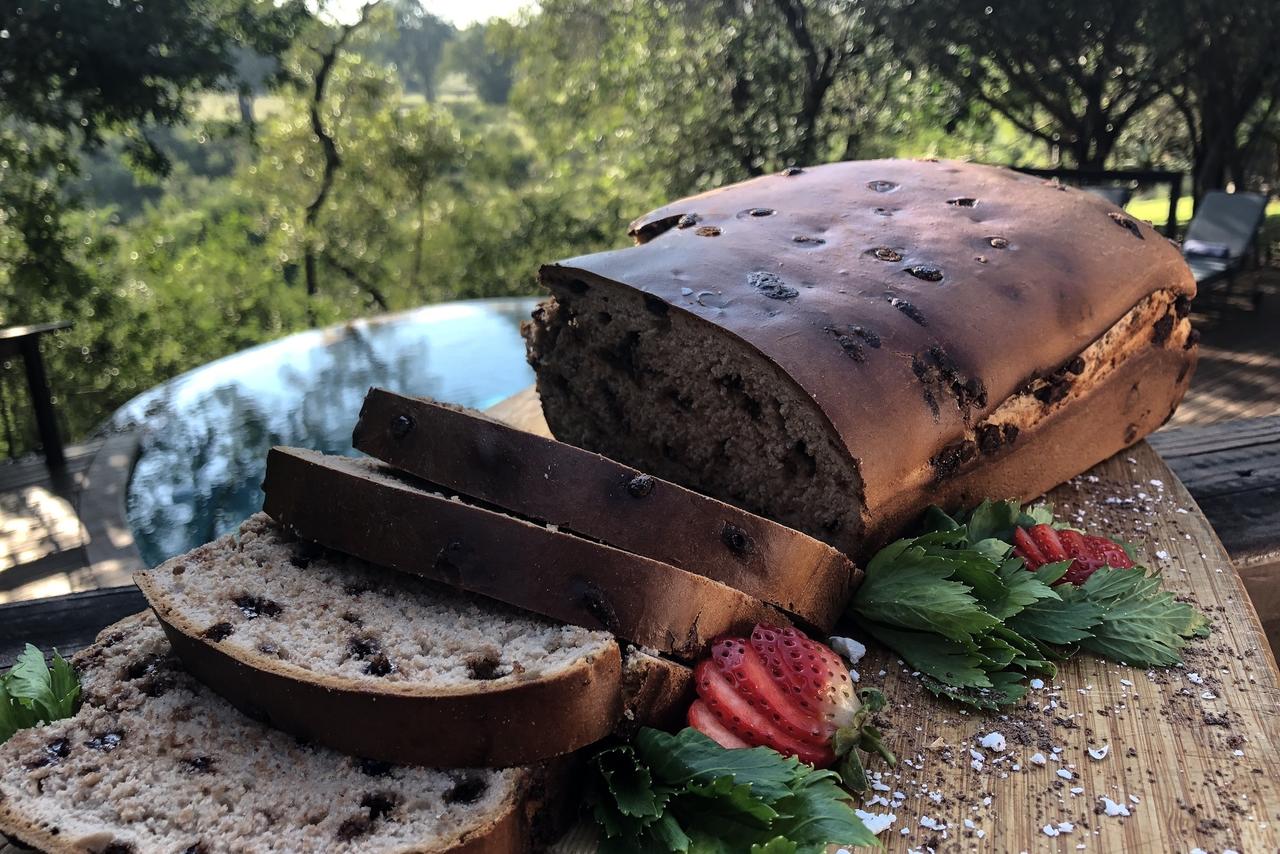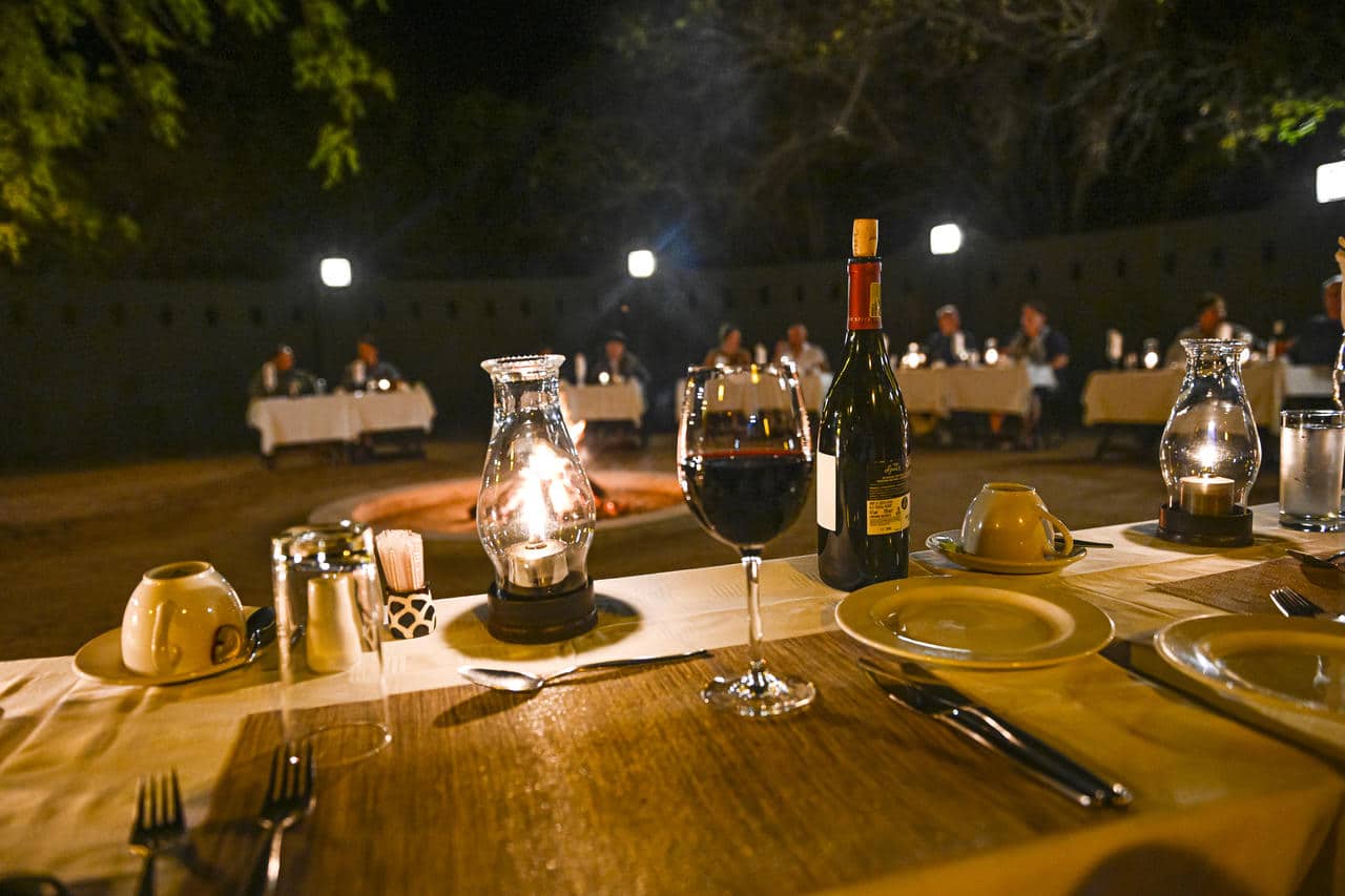 Meals at Elephant Plains Game Lodge are served around a fire in the open-air boma under a starlit sky. Adjacent to the swimming pool, the expansive wooden sundeck offers spectacular views overlooking the waterhole and plains below.