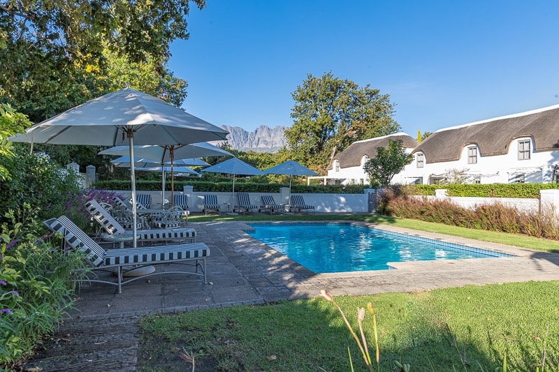 The bedrooms are set around the original stable block and upstairs bedrooms have high thatched roofs. Each of the bedrooms is decorated in a classical style with a personal safe, hairdryer, tea/coffee facilities, bar fridge, television and telephone. They have been renovated by introducing a more contemporary colour scheme whilst retaining their original elegance. All around are tranquil gardens of roses and herbaceous borders.