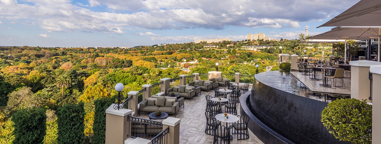 Views focus on the gardens, courtyards and the city’s dense canopy of trees stretching off to the horizon. Some rooms overlook the neighbouring Johannesburg Zoo. Animals may often be spotted beneath the trees and lions can be heard roaring before sunrise.