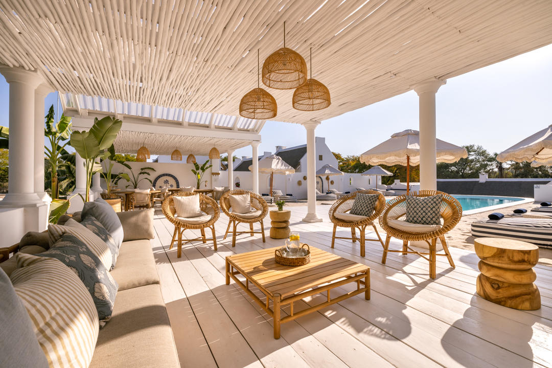 Featuring thatched high ceilings and tall archways, the hotel welcomes light and infuses a sense of tranquility and space. Modern, minimalist interiors with a light blue, white, and natural brown palette are accentuated by large, generous verandas overlooking grassy lawns dappled with shade from leadwood and raintrees.