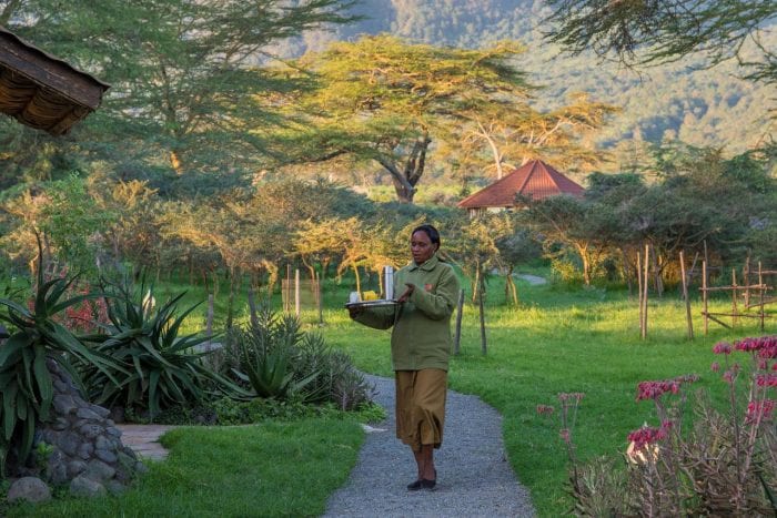 The rooms at Hatari Lodge have been lovingly decorated in a retro style, evoking the 60’s and 70’s – the time of “Hatari!” and the beginning of safaris in Tanzania. All the nine comfortably furnishedย rooms have a spacious ensuite bathroom and a stylish mix of local textiles, brightly patterned Kenyan carpets and handprinted wallpaper. In the winter months, an open fire crackles invitingly in each bedroom.