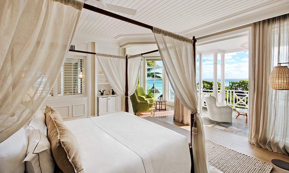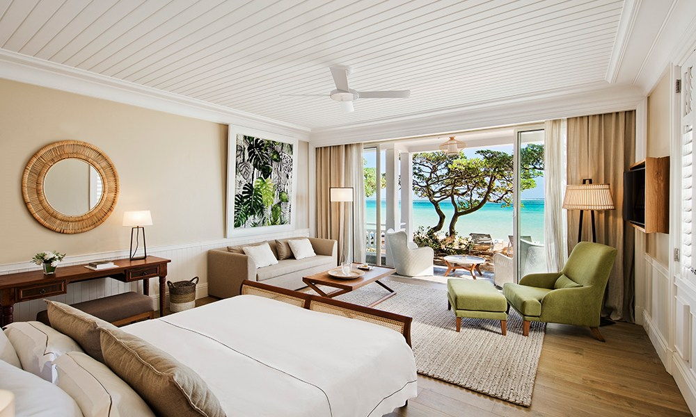 158 generous deluxe rooms (54-62 mΒ²) are decorated with simple classical lines with floor to ceiling French doors opening onto a private terrace or balcony with delightful views of the gardens, river or beach. 62 have sea views whilst 16 rooms have a beach front location. Each has air conditioning, ceiling fan, bathroom with bath and shower, safe, mini-bar, tea/coffee facilities, flat screen satellite TV, and internet access. Each room can take two adults and two children (or one teenager). 20 junior suites (81 mΒ²) are more spacious with hexagonal sitting area, four poster bed, signature antique baths, terrace with outdoor shower (mostly) and butler service. Most have a seaview and all are connected to deluxe rooms creating a two bedroom family unit if needed.