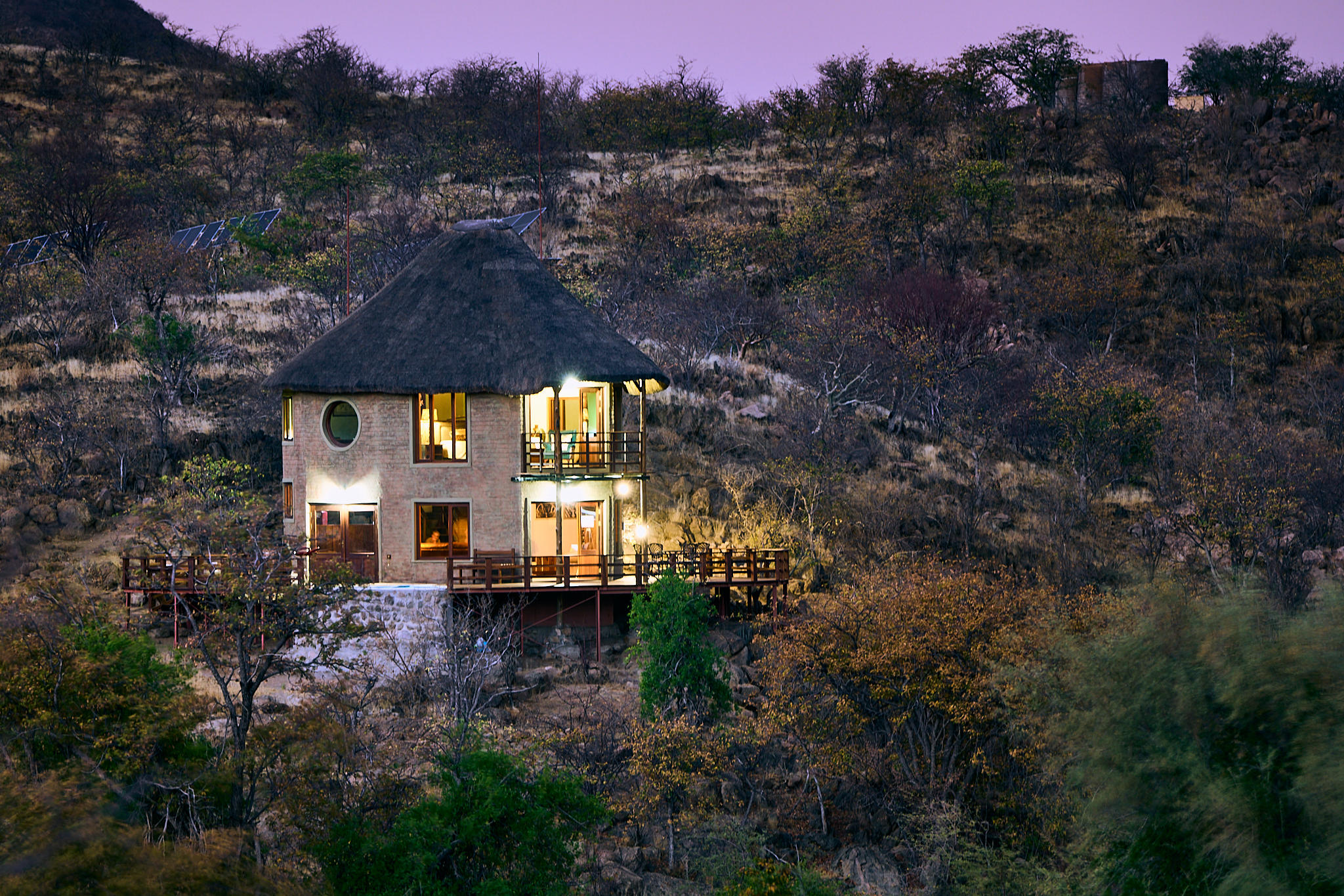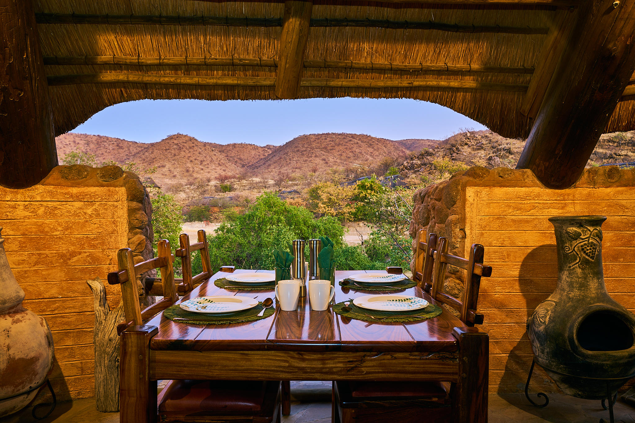 The eight spacious stone and thatch chalets at Huab Lodge are comfortable and well-equipped with two double beds, ceiling fan, fresh cold water, tea/coffee facilities, bathroom with double vanity and a shower with a view as well as a large viewing deck overlooking the valley. The main lodge at Huab Lodge is large and relaxed in feel, open to the Namibia elements, filled with comfortable chairs and interesting books. Good food and wine are served at the communal table for a convivial and relaxed evening with your hosts. Here guests can make friends and exchange opinions and learn more about the country. Huab Lodge is run on eco-friendly solar power yet also offers a high speed internet connection.
