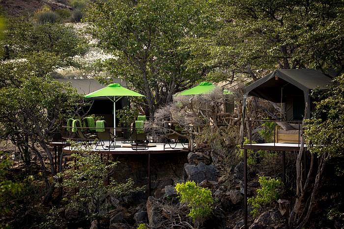 Huab under Canvas in Damaraland is an exclusive base camp for tracking desert adapted black rhino in an area which has the highest rate of tracking success in north-west Namibia. The semi-mobile tented camp is also located in a gloriously remote area, on a private concession, hidden among trees on the banks of a tributary of the Huab River. Getting to //Huab under Canvas is a 4×4 adventure in itself as the changing flow of the ephemeral rivers in Damaraland means that the routes are never quite the same twice! Guests arrive with their private guide and each party of guests has the whole camp to themselves, looked after by a multi-skilled team of four staff, drawn from the local community.
