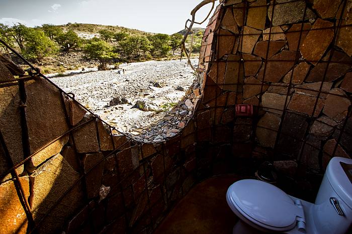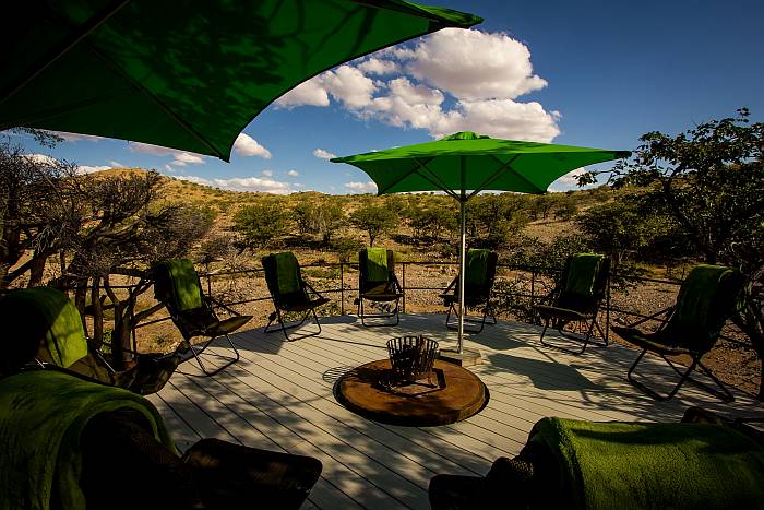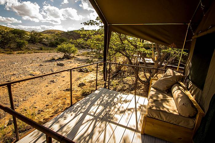 //Huab under Canvas is a ‘first’ for Namibia, in that it is more comfortable and stylish than a typical mobile camp but much more light-weight and with a lower environmental footprint than a permanent tented camp. The size of the camp is variable but there can be up to 8 en-suite tents on decks overlooking the generally dry riverbed. We think “glamping” is an apt description as there are flush loos and solar-powered electricity but bucket showers and pitchers rather than running water. The tents have twin beds, twin luggage racks, a bedside table and a hanging wardrobe so they are what we enjoy as classic “old school” luxury tents, with en suite bathrooms open to the skies so you can take a safari shower in fresh air.