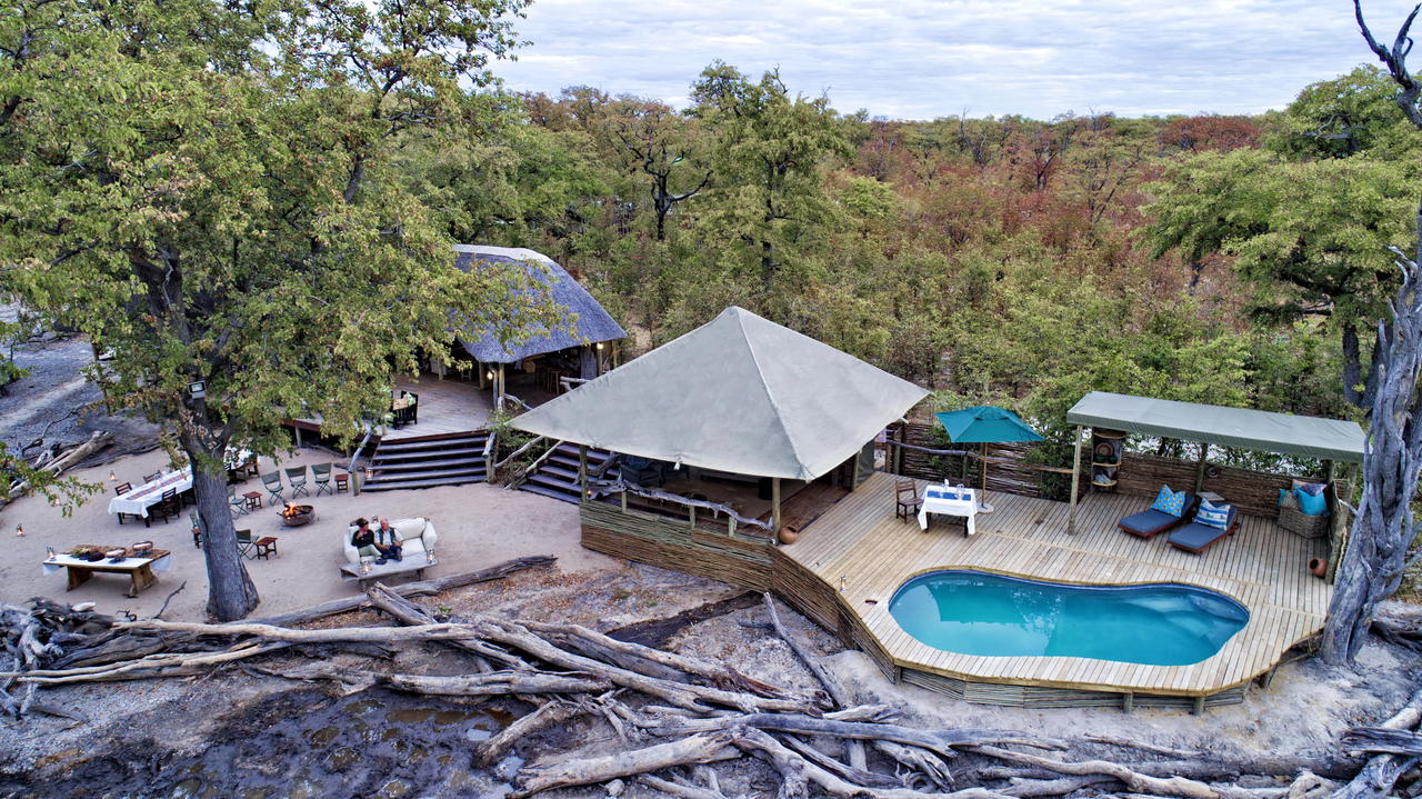This tented camp borders the Moremi National Park and the Khwai River. And is positioned 12 km north of the Khwai River. It lies within Cathedral Mopane forest overlooking a natural Mopane Pan. The pan is a constant water supply to many species of birds and animals year round. The rains in December to March flood the area creating an enormous water feature. This entices Hippo, Elephant and Buffalo, not to mention the exceptional array of water birds. As the pan shrinks from March through to late November they pump water to the pan from one of their solar-powered boreholes. Game activities include game drives and bush walks.