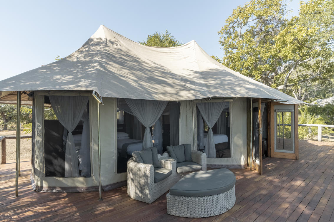 Ila Safari Lodge boasts a 180 degree view of the Kafue River and makes the most of this by placing the beautiful semi circular boma, infinity pool, bar and open air restaurant on the banks of the mighty Kafue River. There are ten luxury safari tents, two of which are larger suitesย just perfect for families. Each tent has its own private deck looking out over the Kafue River. The tents allย have their own individual African design but still sit comfortably in their natural surroundings. These sophisticated tents are all en suite with either outside showers or baths.