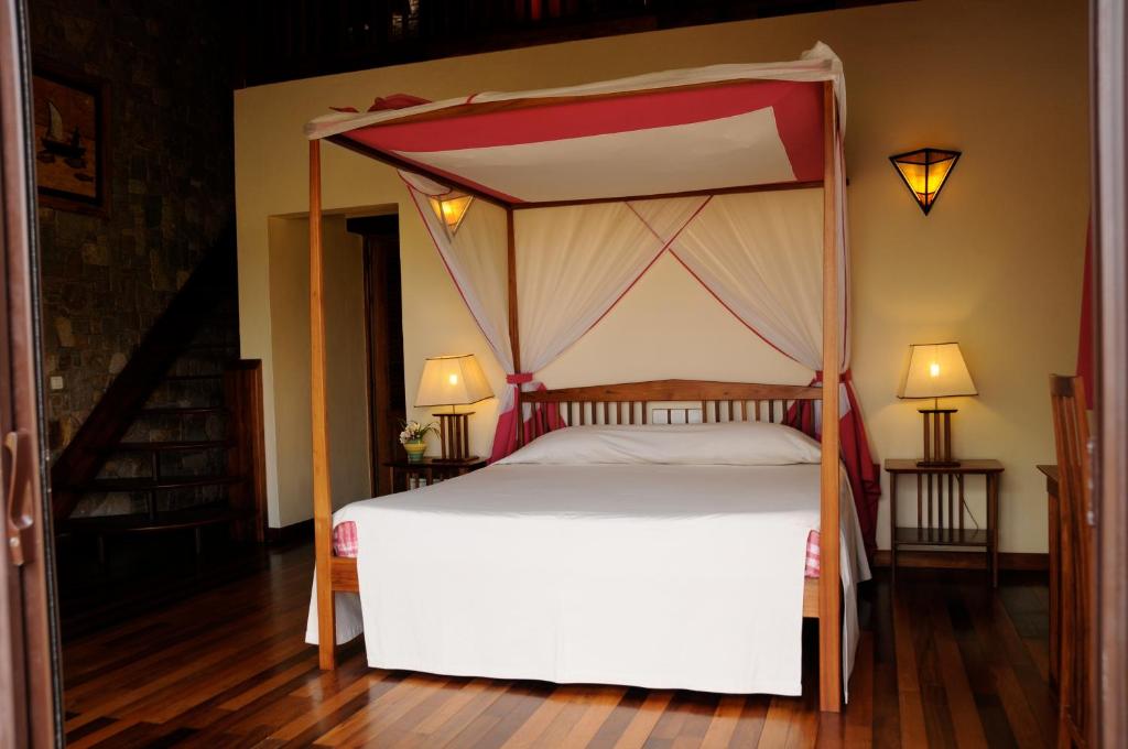 Le Jardin du Roy is harmoniously integrated into its environment by incorporating traditional materials such as rosewood, marble and labradorite. The lodge has 40 rooms (16 doubles, 16 triples and 8 family rooms). This granite-walled rooms are arranged in houses around an attractive garden and large swimming pool. They are designed to blend into the natural surroundings.