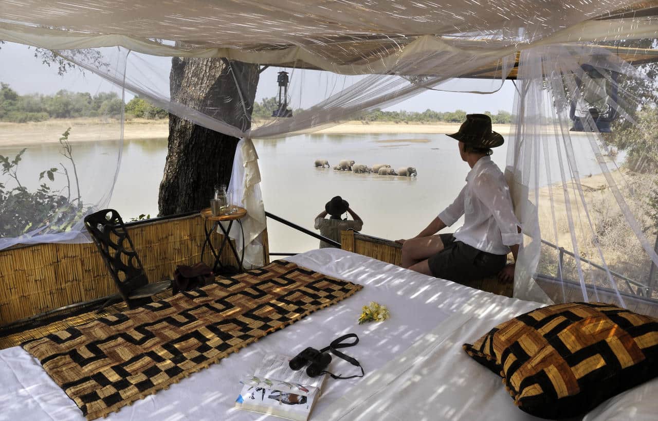 At the heart of this friendly and relaxed camp, guests all come together in their open sided lounge and dining area, sharing a drink over the thousand-year-old leadwood bar. The lower deck extends out over the Luangwa with large, comfy sofas for guests to curl up and enjoy the sights and sounds of the river and its wild residents.