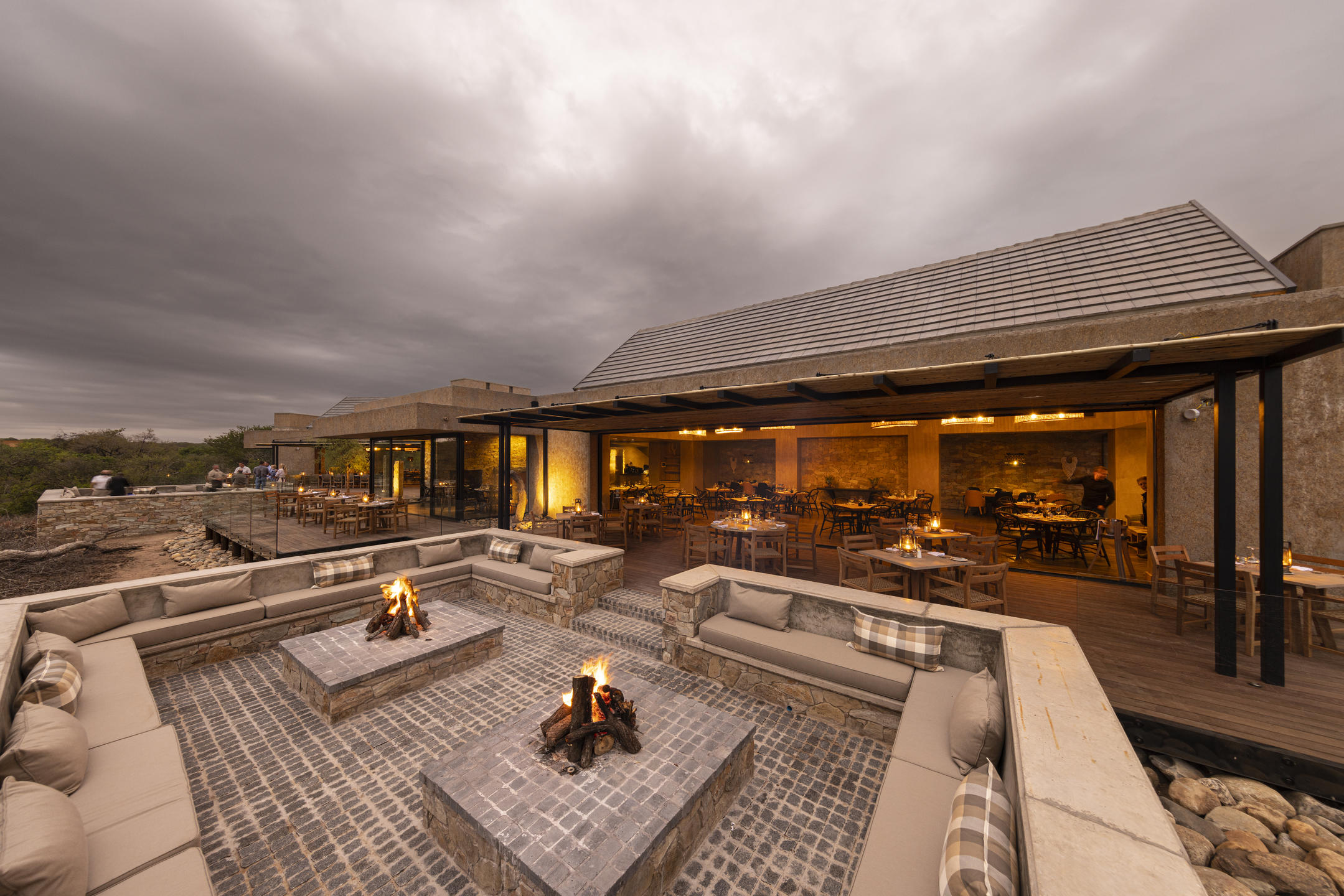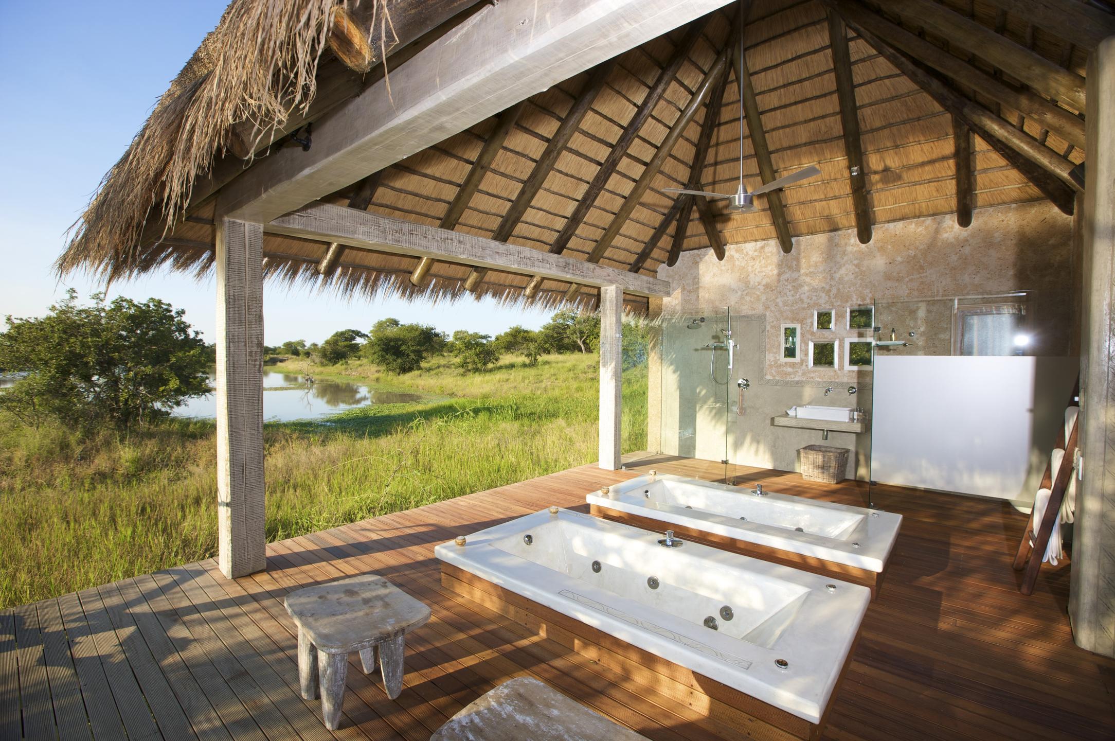 Kapama River Lodge is the largest game lodge in the Greater Kruger National Park area and boasts 40 Suites, 16 Spa Suites, 2 Royal Suites and 4 FamilyΒ Spa Suites. Β Each of the spaciousΒ suitesΒ has an en-suite bathroom and views of the reserve. The central guest areas include a swimming pool, lounge, curio shop and boma. The long, L-shaped lounge and bar, under double-volume thatch, follow the line of the pool to create an airy but cosy atmosphere. In winter, a double-sided fireplace provides additional warmth. Meals are served buffet-style and offer a variety of pan African dishes.