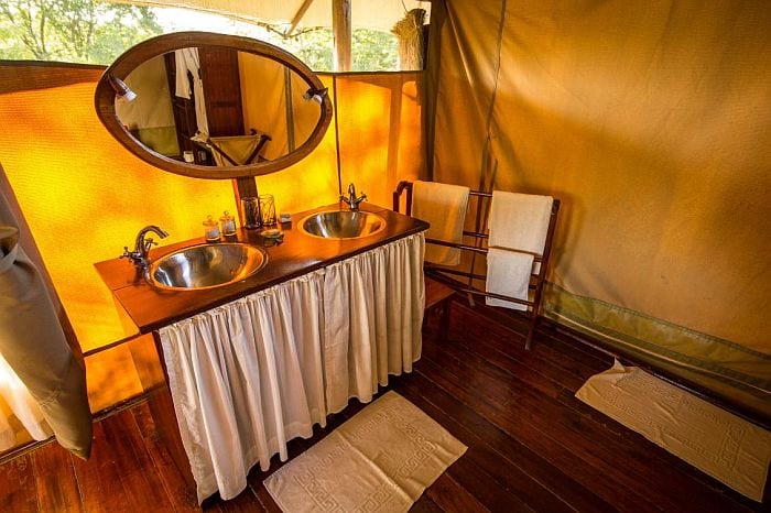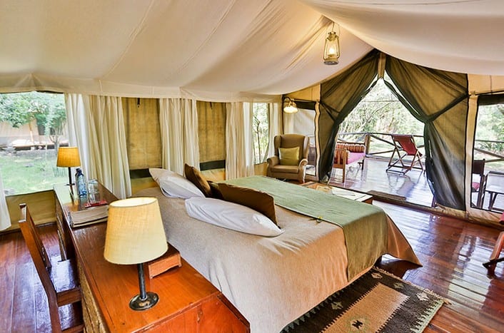 The Camp comprises 22 large luxury canvas tents, each located with a stunning view along the Mara River. The restaurant, reception, lounge and bar are set on a raised wooden deck and furnished with accurate reproductions of Karen Blixen’s private furniture.