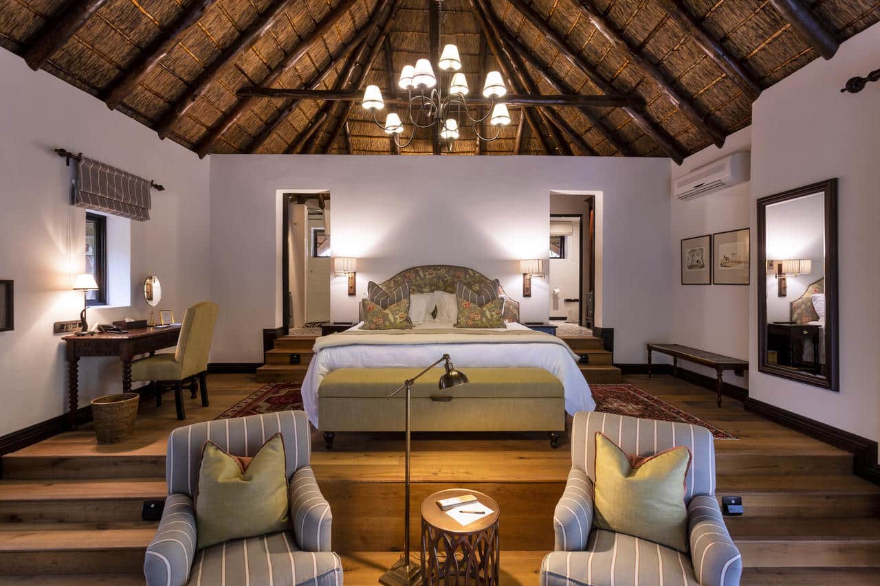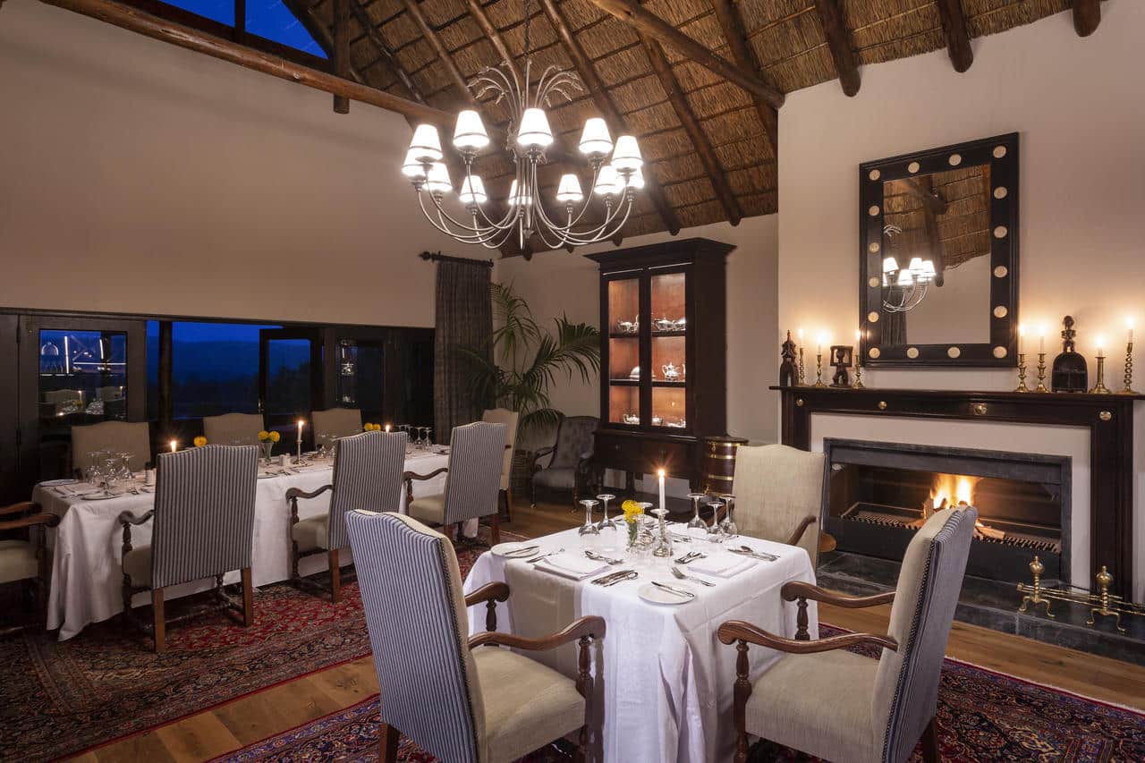 The main lodge is constructed from stone and thatch which blends seamlessly with the surrounding African landscape. It overlooks a large water hole popular with hippo, giraffe, elephant and other game. There’s a heated rim-flow pool on an adjacent terrace which seems to melt into the waterhole below. You can dine outdoors under the African skies, or indoors in the elegant dining room. Above the lounge is a library/meeting room with wifi. This room provides a quiet place to curl up with your favourite book or catch up on some emails if necessary.