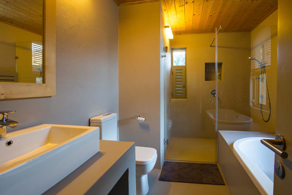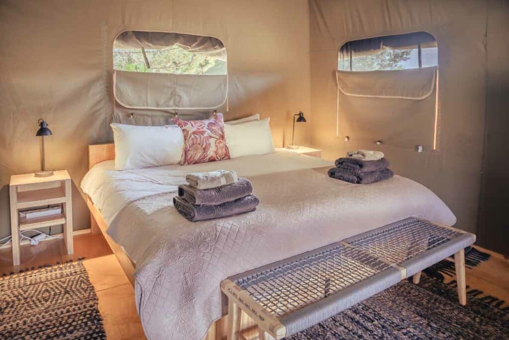 The two bedroom luxury self-catering tents are much simpler with a main bedroom (open plan, a secondary smaller bedroom, one bathrooms, a simple kitchen as well as a fireplace, deck, and outside braai area. Note that these are a little further away from the main area if you want to have meals there. But walkable.