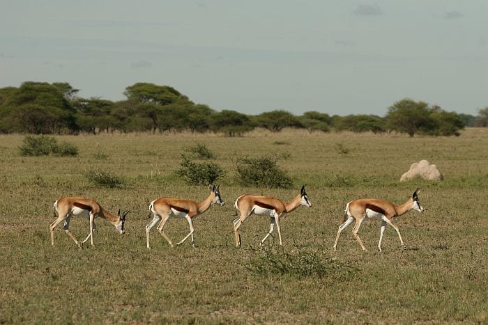 The Nxai Pan itself is a fossil lake bed about 40 sq km in size. During the summer rains from November to April – the pans become covered in nutritious grasses. Nxai Pan is known for its huge springbok population and once the rains begin, gemsbok, elephant and zebras migrate into the region. Thousands of zebras come to drop their young here. Extraordinarily large herds of giraffes – up to 30 in a group β are also seen. These large herds of zebras, springbok, and wildebeest attract many predators – lion, cheetah, jackal and both spotted and the more elusive brown hyena, as well as wild dog and the secretive leopard (rarely seen). There are also large numbers of bat-eared foxes and raptors around. Once the rains have started the bird life in the area is also excellent. Thus Nxai Pan is unusual in that the best time for game-viewing here is actually during, and just after, the summer rains from November onwards. (The dry season is typically the best time for game-viewing in the nearby Delta).