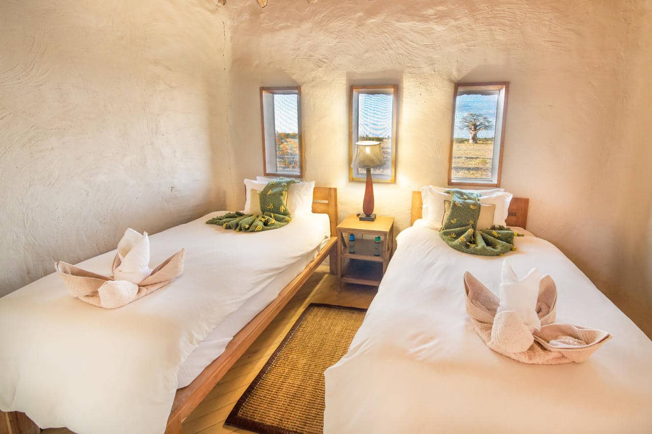 The lodge faces east so that you can enjoy the rising sun over the reserve. Kwando Nxai Pan camp comprises nine purpose-built desert rooms connected to the lodge by raised walkways. Each room is en suite with an additional alfresco shower and a private viewing deck. The lodge is solar-powered with fans in all the rooms. (All rooms have thatched roofs and insulation to keep it cooler in the summer and warmer in the winter). The main area consists of a dining room, lounge area, library, curio shop and a viewing deck with swimming pool. One room is a family room sleeping 4 people. Families with children under 12 years are welcome at Kwando Nxai Pan camp,Β but you do need to take a private safari vehicle.