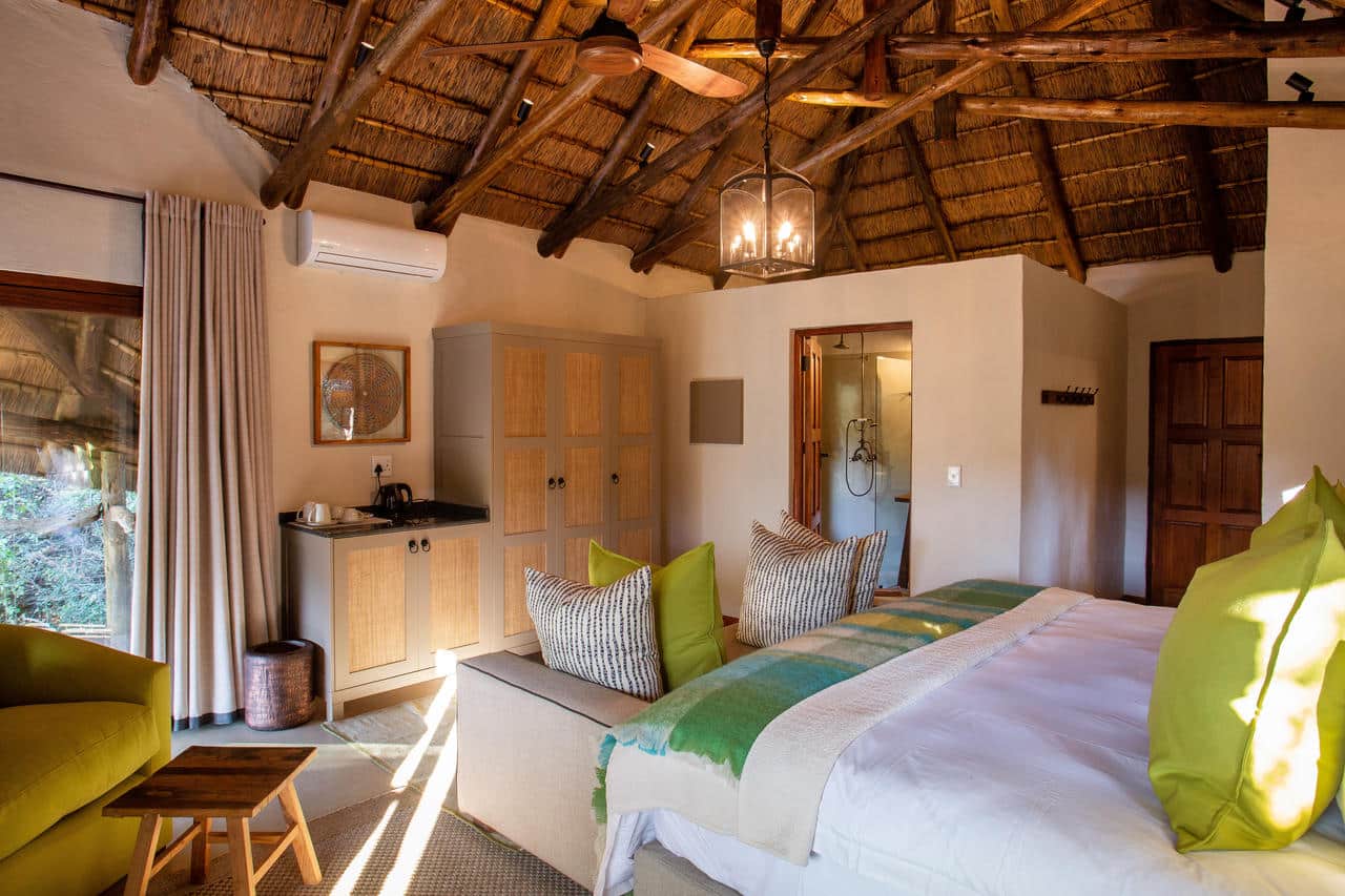 Lalibela Marks Camp is all about family safaris. It lies approx 30 mins drive into the reserve from the reception lodge. The main lodge is decorated in a relaxed Pan-African style. The lodge sleeps up to 20 guests in 8 chalets, four of which are family chalets. Each comfortably furnished chalet has an en suite bathroom with a ceiling fan for those warm summer nights. Each opens up onto a private deck with views over the waterhole. They have a choice of three family rooms and a two bedroom family chalet. The family rooms have a small children’s area with two built in beds separated with a reed partition from the parent’s bedroom. There is also a larger two bedroom family chalet with a small sitting area which can also accommodate extra children so this is ideal for a family with 3 or more kids or a family party.