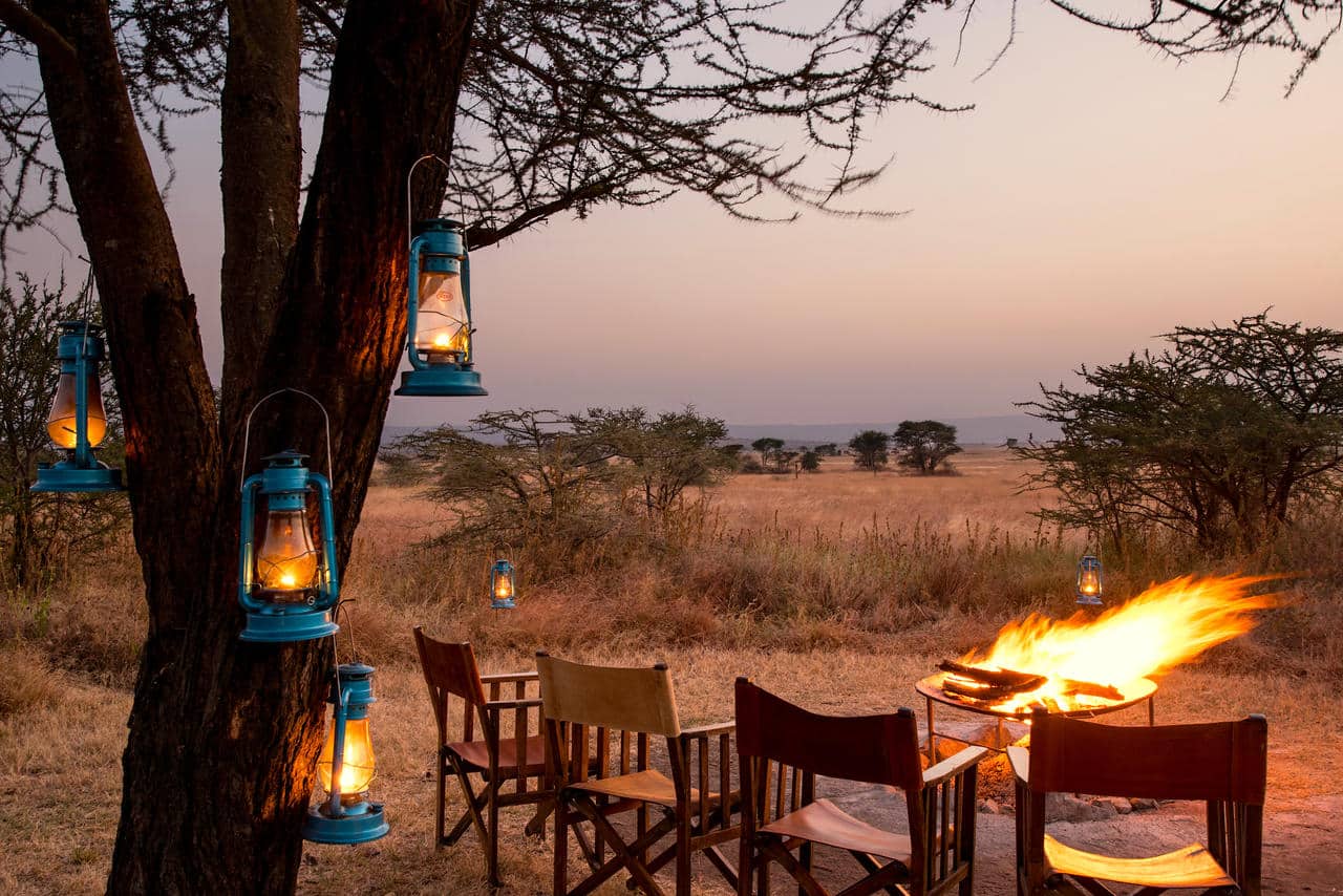 The camp has been carefully positioned right at the end of a blind valley, so other vehicles will not interrupt the views across the plains during the day, and in the evening, uninterrupted sunsets with no electric lights in sight can be enjoyed. The mess tent with its separate bar, sitting and dining areas is beautifully decorated with leather sofas, side cabinets, rugs and chests. In the evening, guests can gather inside under the chandeliers or outside around the campfire under starlit skies for sunset cocktails and to share their safari stories.