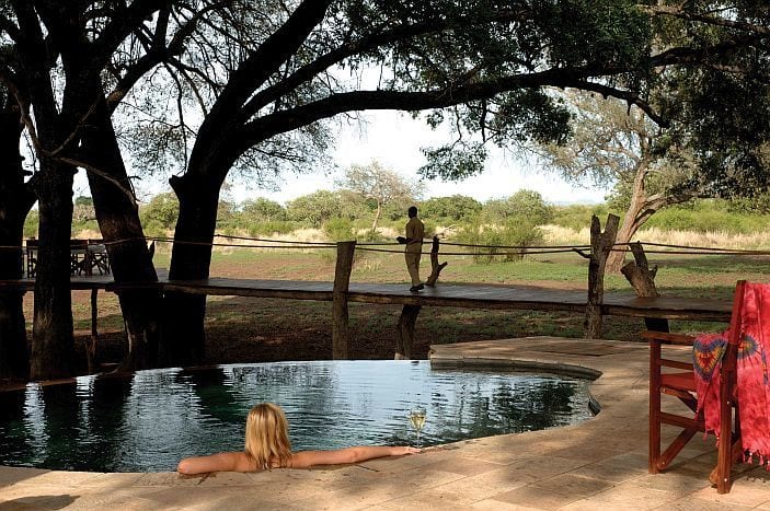 With four large en suite bedrooms, it is ideal for familiesΒ or a group of friends seeking a little privacy in the South Luangwa. Two bedrooms are on the ground floor and two are upstairs (with two fairly steep floating staircases) on either side of the living area. Every bedroom is subtly decorated to mimic the elements β water, earth, wind and fire. Each has its own ensuite glamorous bathroom, four poster beds and private veranda to soak in the views.