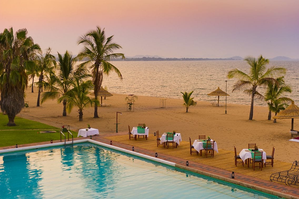The Makokola Retreat is one of the best-known Lake Malawi hotels. It lies on the southern lake shore near Mangochi. The hotel is spaciously laid out in 10 acres of well-tended gardens. But it is the private beach that will draw your attention. The vast expanse of pale sand (600 metres) is dotted with low palms, thatched sunshades and sun loungers with padded cushions.