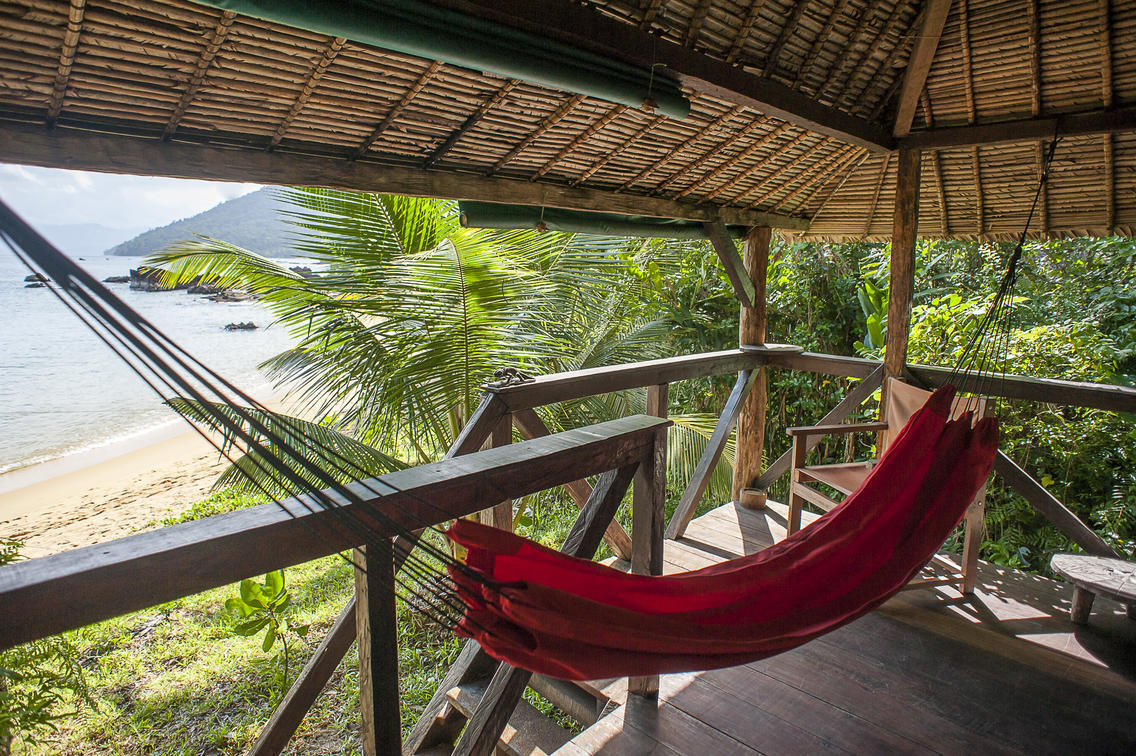 The two communal areas known as 'The Beach House' and 'The Sea Deck' are also stilted, thatched and open-plan, providing natural lighting and ventilation in a minimalist and energy-efficient style. The sea deck is spectacularly sited on the rocks overhanging the sea, with wrap-around views of the ocean, the forested coastline and the fish below.