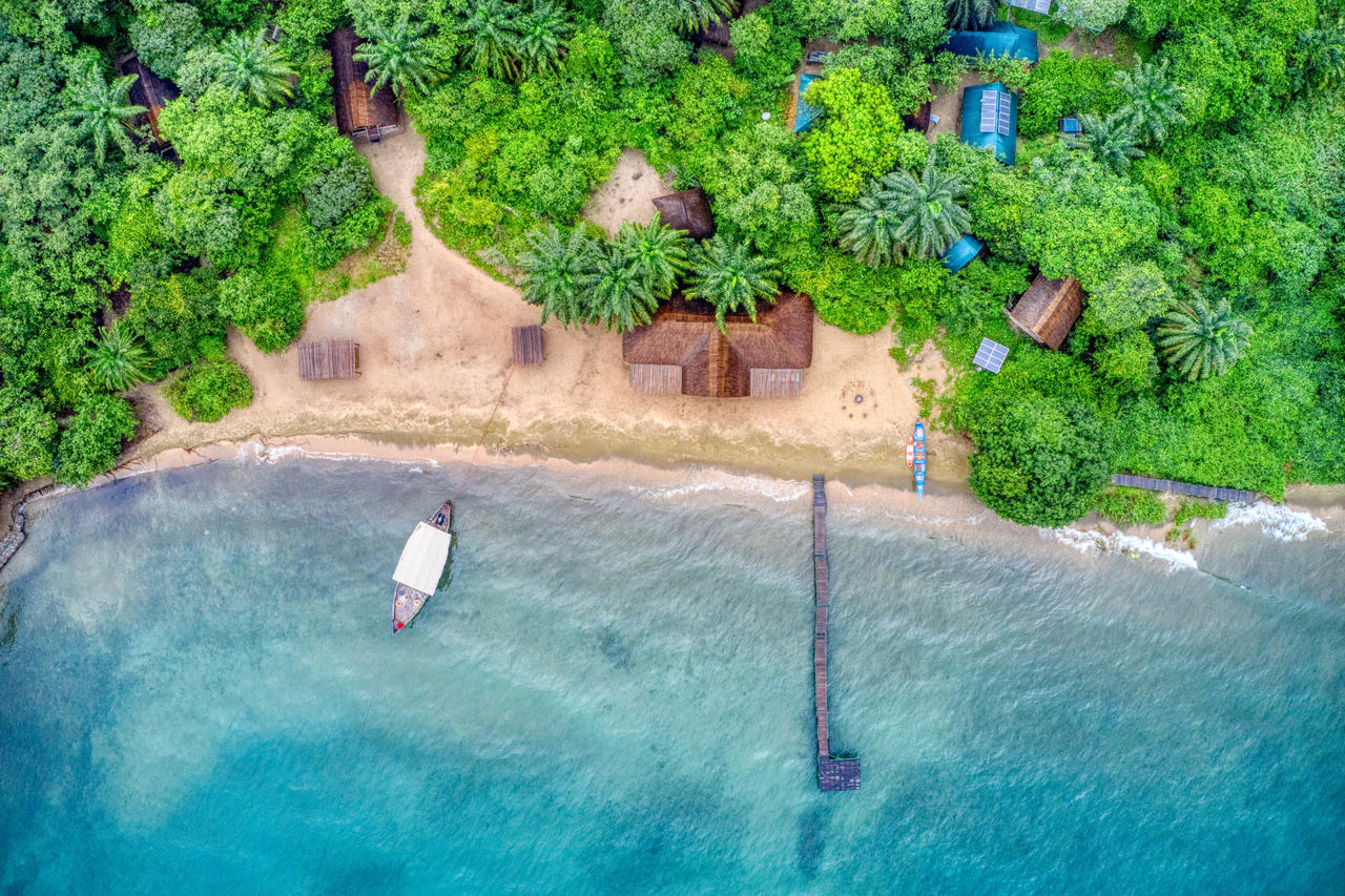The chimps spend most of their day playing, grooming and looking for food so they are fascinating to watch but fast-moving. At some times of the year they are to be found high up the mountains which rise dramatically behind the lodge; at others they can descend right to the beach, depending on what fruit is ripe to harvest at the time.