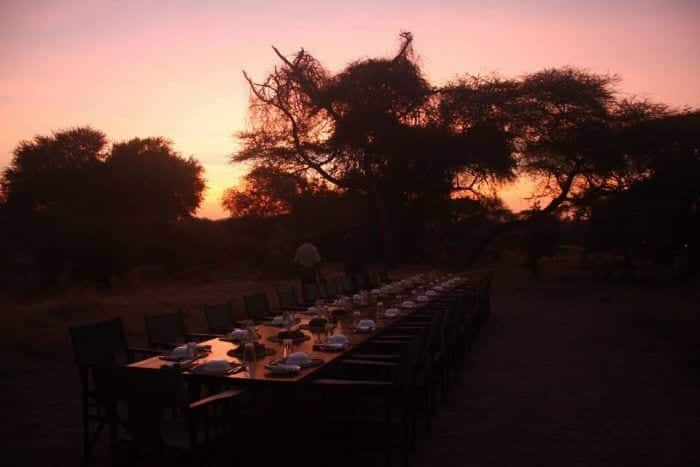 The dining and lounge tents are open sided with views to the dry river bed, which is used by the game as a corridor to fresh grasses. Comfortable sofas and chairs are brightly coloured with coffee table books on hand. Evening dining is a convivial affair lit with candles and storm lanterns.