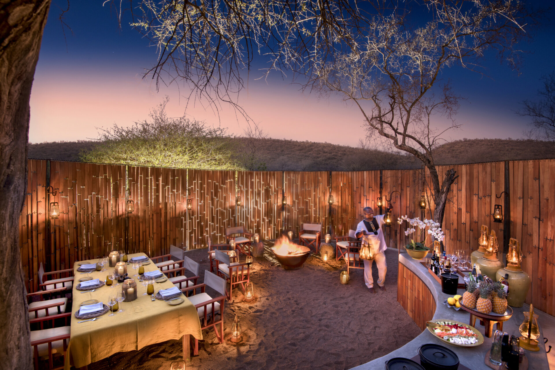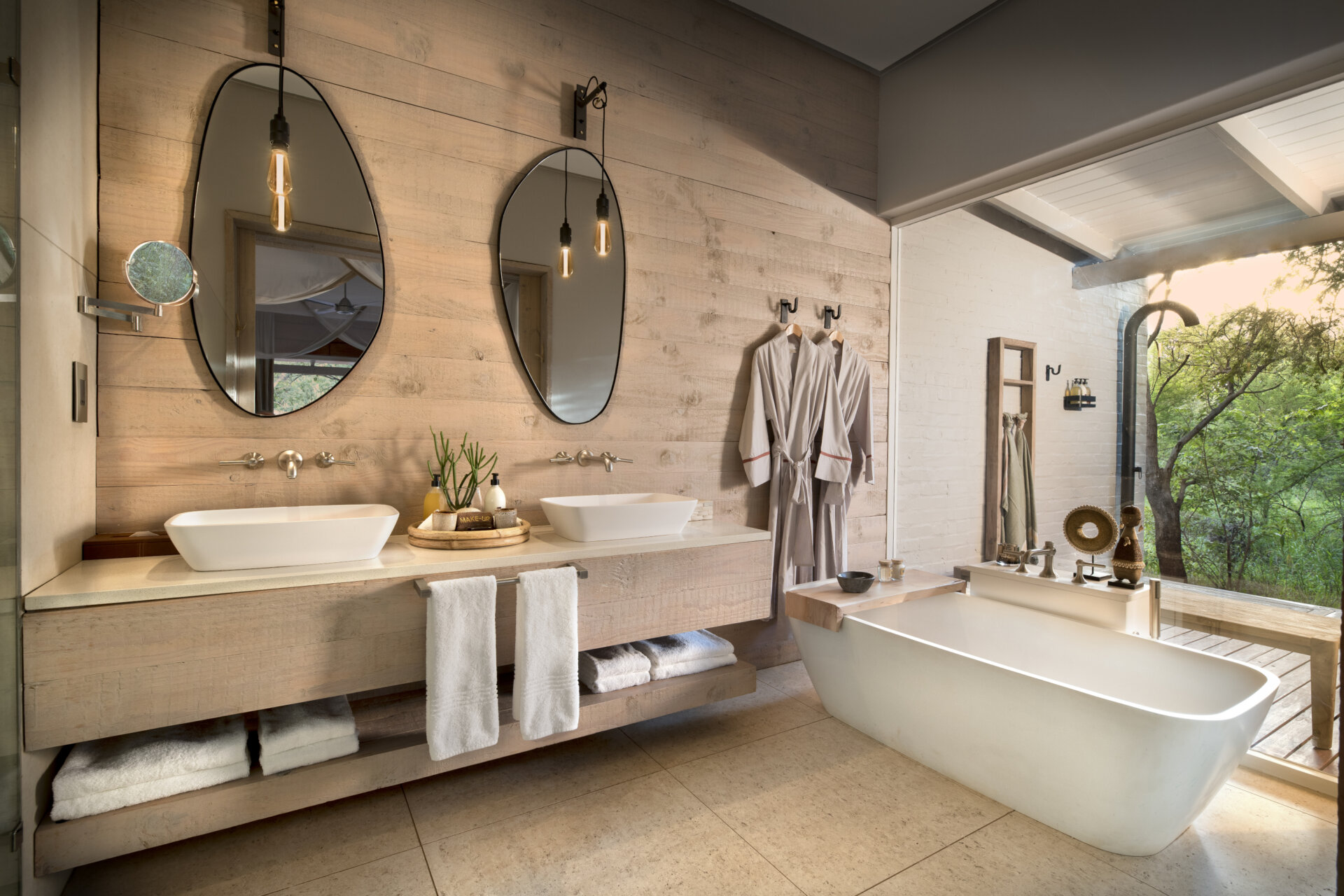 Across a small bridge (and completely hidden from the first villa) is the Owner's House – a decadent ultra-luxurious residence. This consists of two suites and beautifully appointed public rooms with an elegant dining room and lounge. This is decorated in a similar fashion to Morukuru River House but with a 'state of the art' Wine cellar featuring some of South Africa's great estate wines. There's an outside bath under the starlit sky as well as a heated pool and private outdoor sala. Whether reclining together by your infinity pool, or alone in your private sala, or just lying in bed with the doors wide open, the combination of dappled shade, and the sound of nature is deeply restorative. Given the open stairs and valuable artefacts, the Owner's Villa is generally not used for young children.