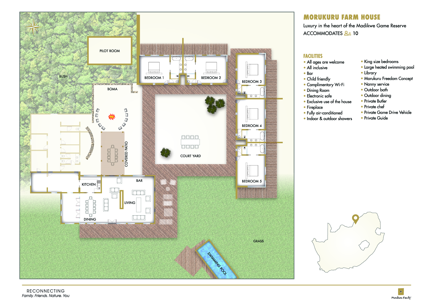 The final villa is the Morukuru Farmhouse which is a safari-chic take on a traditional African farm homestead. It offers five en suite bedrooms suitable for up to 10 people. The Farm House is unpretentious yet stylish, with bespoke items produced by local artists and craftsmen in a neutral palette. The suites are airy and bright with en suite bathrooms, beautiful glass doors that open onto the bush at Morukuru. The Farmhouse offers all the same features as at the Villa and Owners House but with a modern design and green eco-settings. It comprises an open plan kitchen, lounge, dining room, courtyards, wine cellar and fireplace. It is set within a 100 ha fenced in area of bush, home to only general game, so kids can play and roam at will. Morukuru Farmhouse has been built using eco-building principles and has a tranquil garden complete with  pools and ponds.