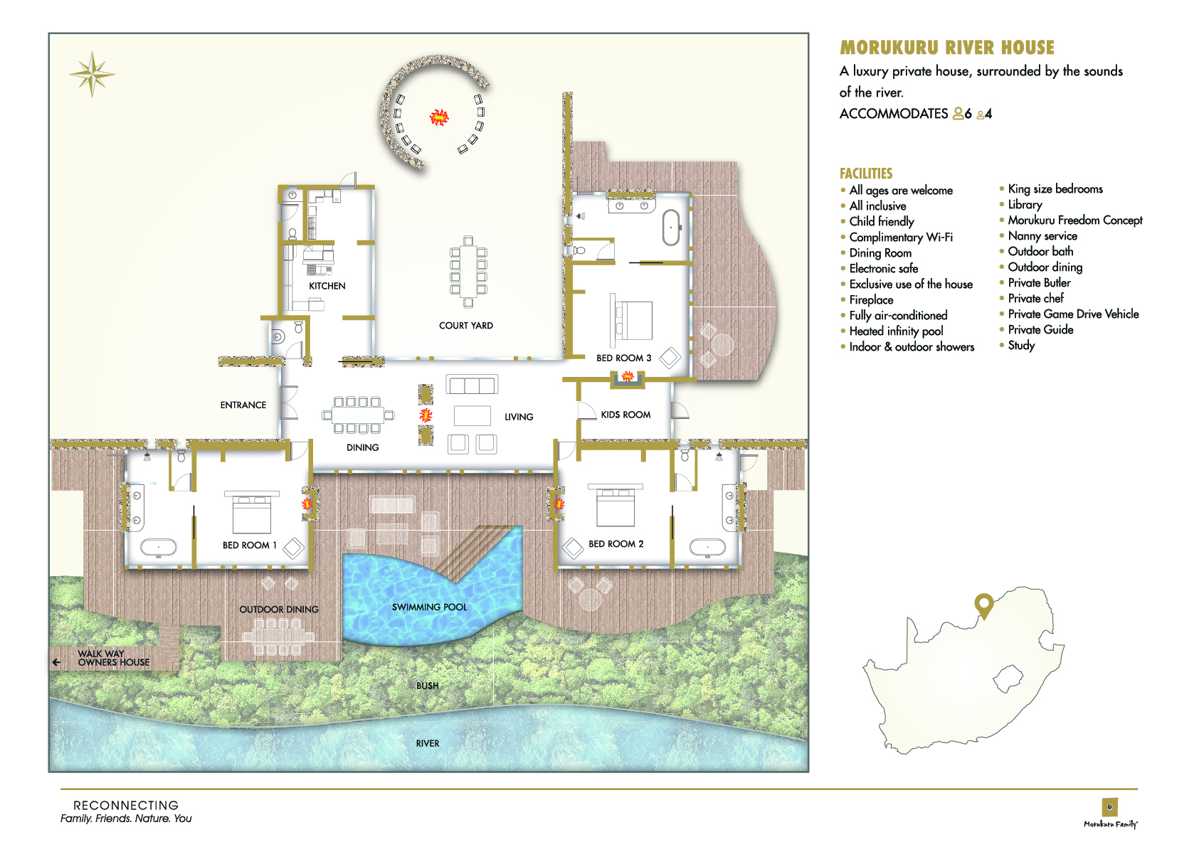 The Morukuru River House is ideal for 6 adults and up to 4 children. River House combines European styling with handpicked African pieces, wonderful indoor and outdoor flow and plenty of al fresco dining. It is perched on the banks of the river where the sound of cascading waters offers a blissful background for your stay. It has 3 bedrooms each with their own private deck, air-conditioning and fan. Each bedroom at Morukuru has a full bathroom en suite with inside and outdoor shower, crackling log fire for the winter evenings and a large tree-shaded private deck. Adjacent to the bedrooms is a family/study room which can accommodate up to four children on two bunk beds. This family room at Morukuru enhances the home from home experience with recreational facilities, including a television and DVD, as well as internet and satellite access, a selection of DVDs and board games. A heated rimflow pool, boma for bonfire feasts and an alfresco dining garden make Morukuru River House a true haven of peace.