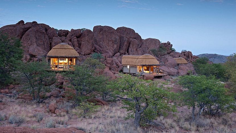At the heart of Mowani Β Mountain Camp is a cluster of six thatched dome-shaped structures which echo the surrounding rugged boulders with sweeping panoramic views over Damaraland. The sides of the bar, lounge and dining areas are open giving a cool feel even on the hottest day.