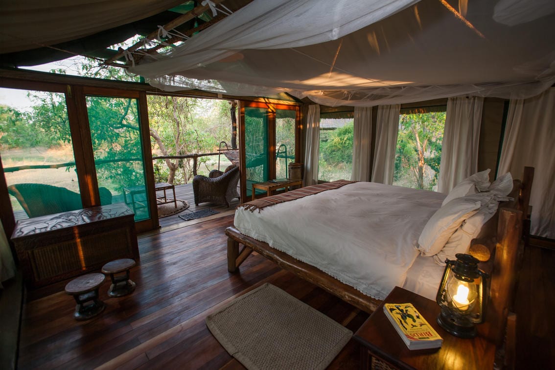 Mvuu Lodge in the Liwonde National Park is a small and very pretty luxury tented lodge, built to blend in with its environment. The setting of Mvuu Lodge is hard to beat. It lies on the edge of a lily-strewn lagoon – where elephant frequently come to drink – just off the Shire river (pronounced Shiree). Accommodation is in eight spacious en suite tented rooms. Each has its own secluded viewing platform & hammock overlooking the lagoon. And they are all hidden away in the lush riverine vegetation to ensure privacy. The first five tents are closer to the lodge and slightly smaller, with an en suite bathroom with bath and outside shower. The final three tents are further away but larger with an open plan bathroom, seaparate toilet, as well as both indoor and outdoor showers.