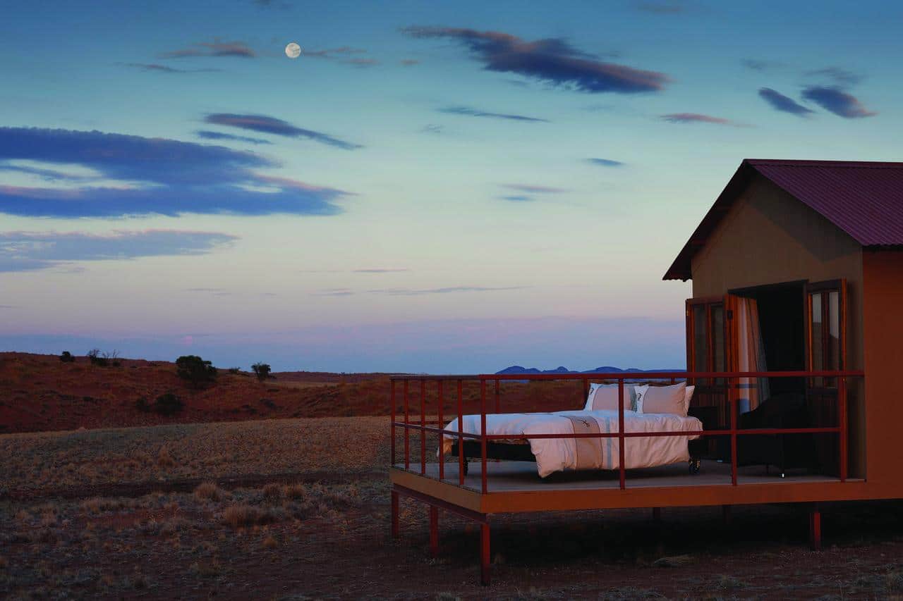 A transfer leads you into a vast desert wilderness to nine wooden cabins. After checking in an optional guided hike is offered to explore the area. As soon as the dunes have transformed to gold and the distant mountains glow purple, it’s time to wheel beds onto balconies to enjoy a night under the glittering sky of the Namib.