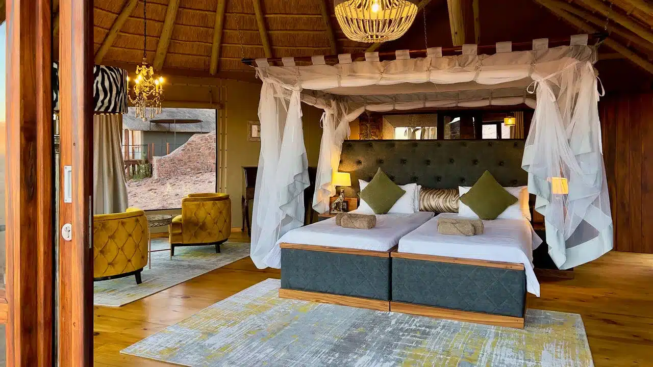 The Superior Suite itself stands apart and offers a luxurious experience of the tranquillity and vastness of the Namib. The modern and refined interior completes the appealing appearance. The Superior Suite has air-conditioning, sitting area, desk, safe, en-suite facilities (shower only), hairdryer, coffee and tea making facilities, refrigerator, mini-bar, plunge pool and balcony/terrace.