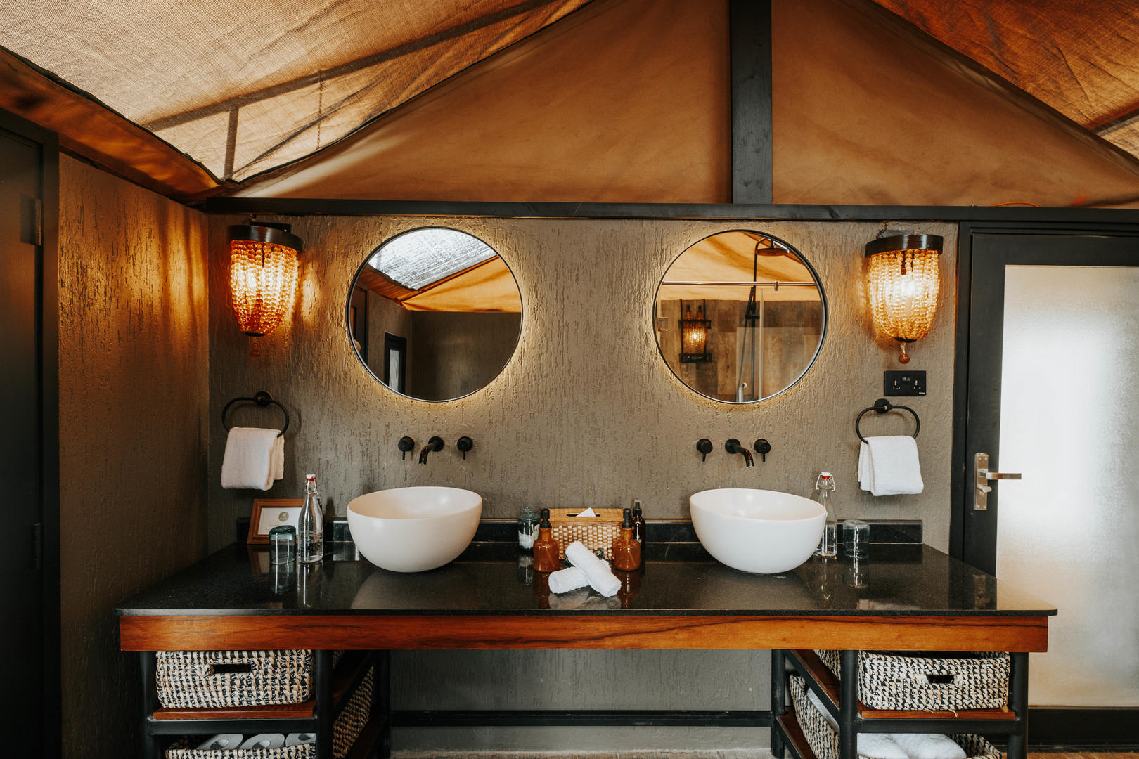 Two of the tents are linked together and designed for families or couples travelling together. Connected by a large lounge overlooking a private deck and complete with plunge pool, these suites are a mix of contemporary and earthy furnishings, complete with fixed bathroom walls and wooden doors. Each tent is expansive with plenty of room for a writing desk and a reading corner.
