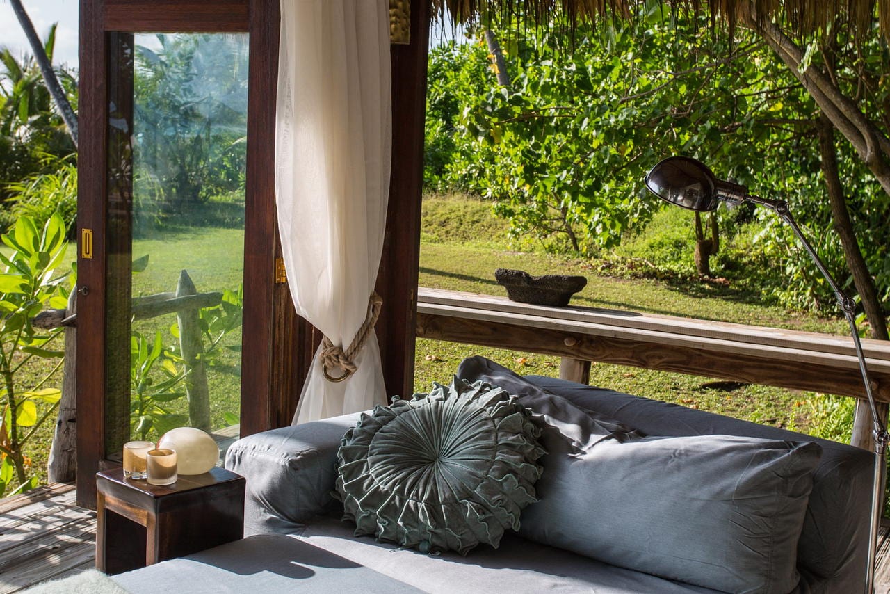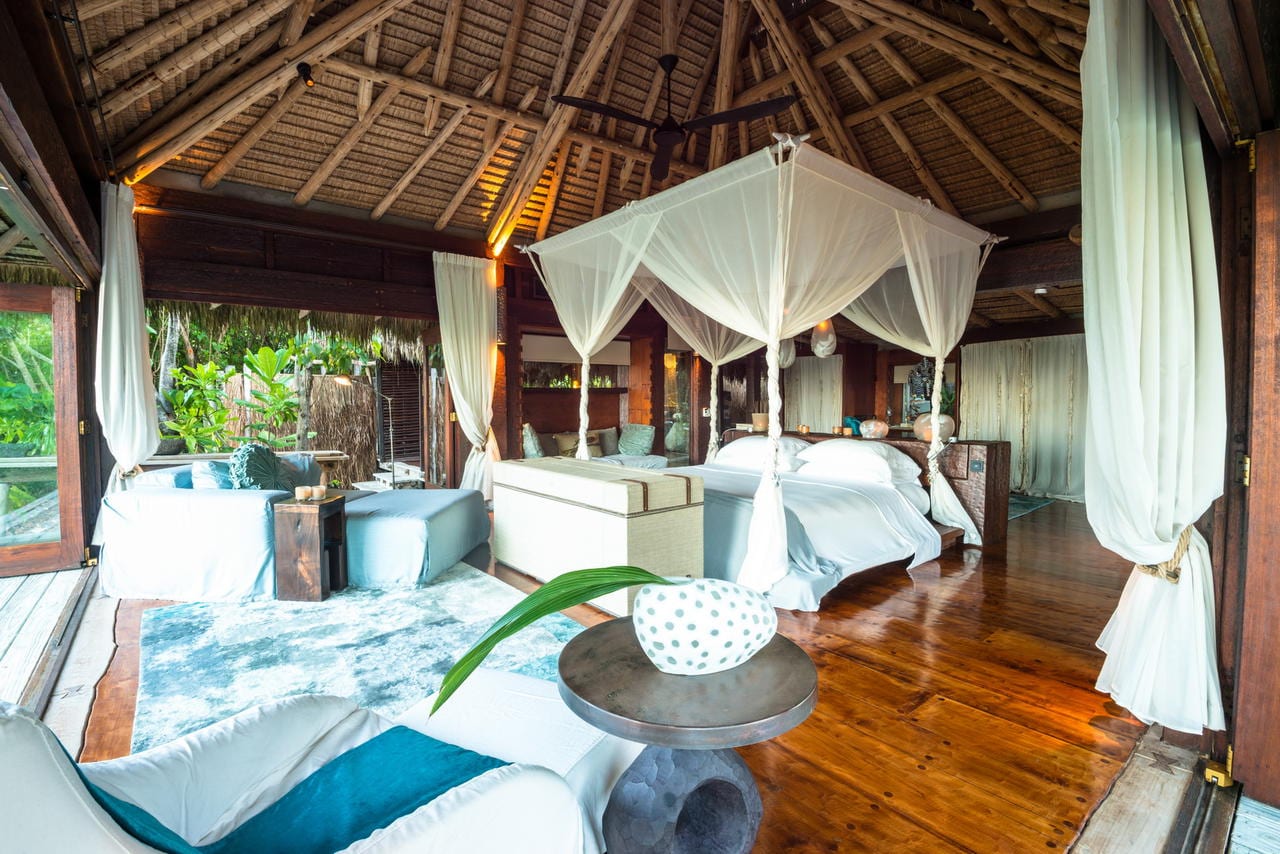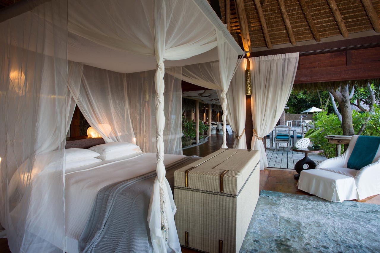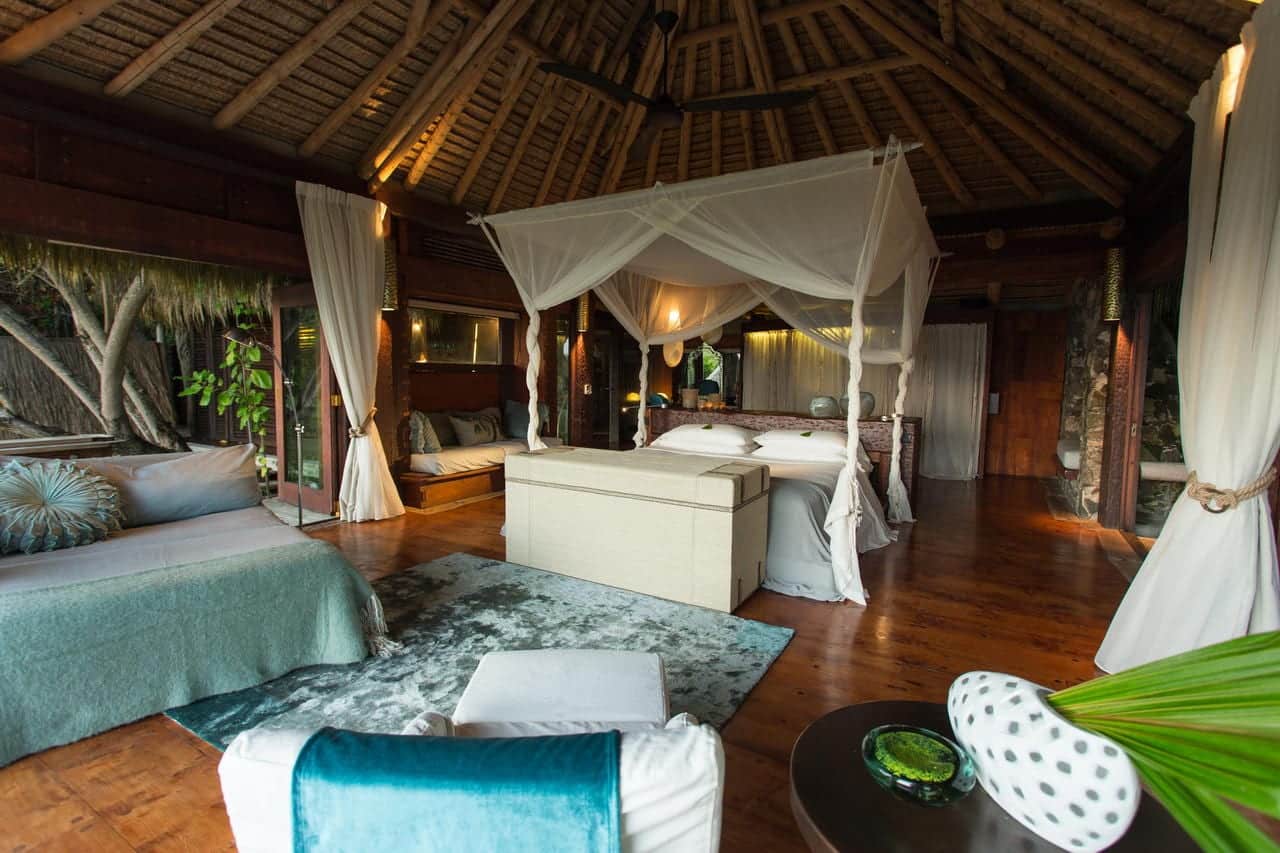 There are just 11 hand-crafted villas on the whole island, each a massive 450mΒ², are located one of the island’s pristine beaches. The philosophy behind them was that you could spread out and truly feel at home and not need to leave your villa if you wished. Each villa has a main bedroom and a second bedroom (available for children or teenagers). Alternatively this second bedroom can be converted in a study. All facilities that you could want are included namely air-conditioning, pukkah pukkah fans, retractable sliding doors to allow uninterrupted views, satellite television, DVD/CD system and internet access. The bathroom has a marble bath and two showers, one indoors and one outside. The private plunge pool, extensive wooden deck and covered ‘sala’ complete the picture.
