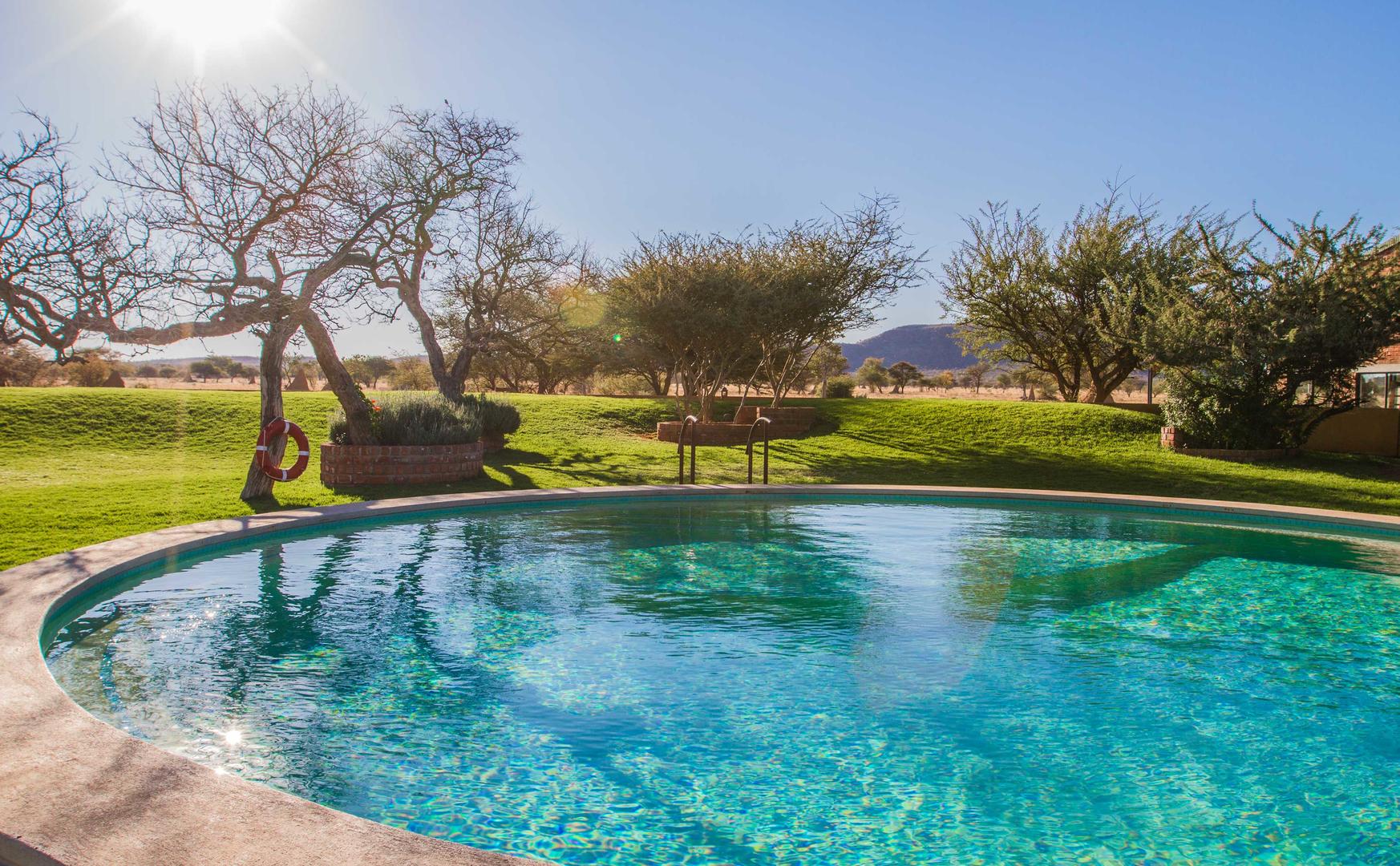 Okonjima Plains Camp has a new lapa (main lodge area), swimming pool and outside sitting area. Plains Camp is offered on a DBB basis and then you pay for whatever extra activities you take.
