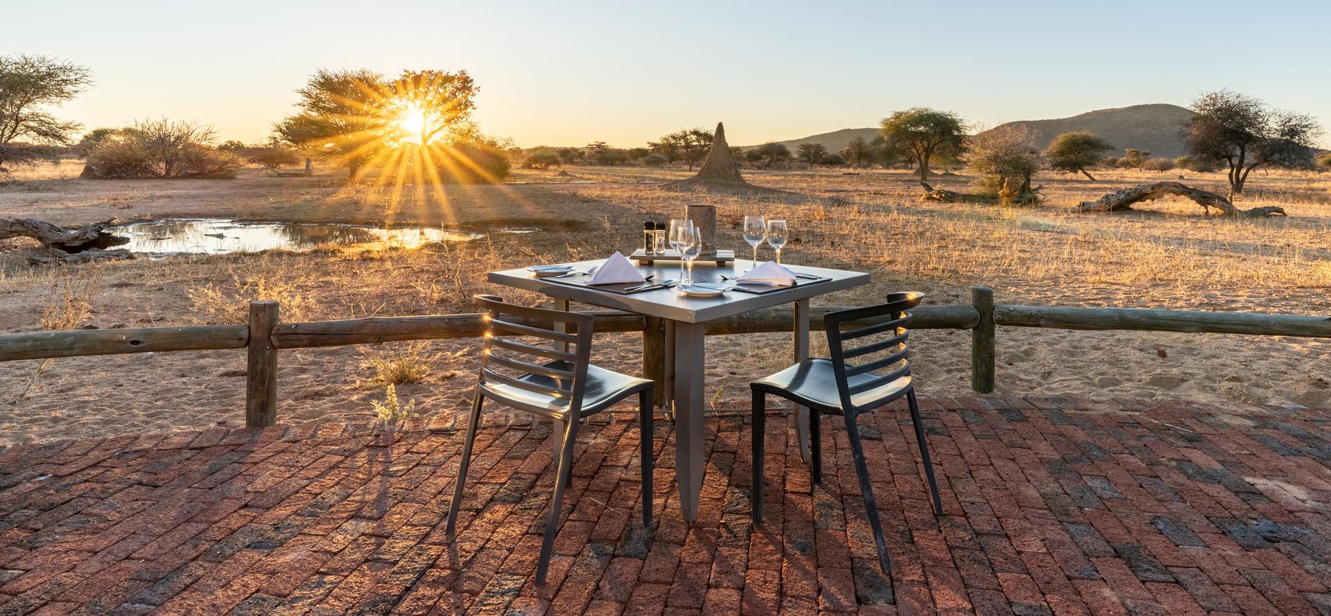 Furthermore the 14 chalets on a small ridge with elevated views over the waterhole and savanna grasslands are beautifully appointed. With a small veranda, mini-fridge to store drinks, coffee/tea facilities, ceiling-fan, safe and a bathroom twin basins and large shower. These are all well-spaced about 10 metres apart. It is family friendly and wheelchair accessible.