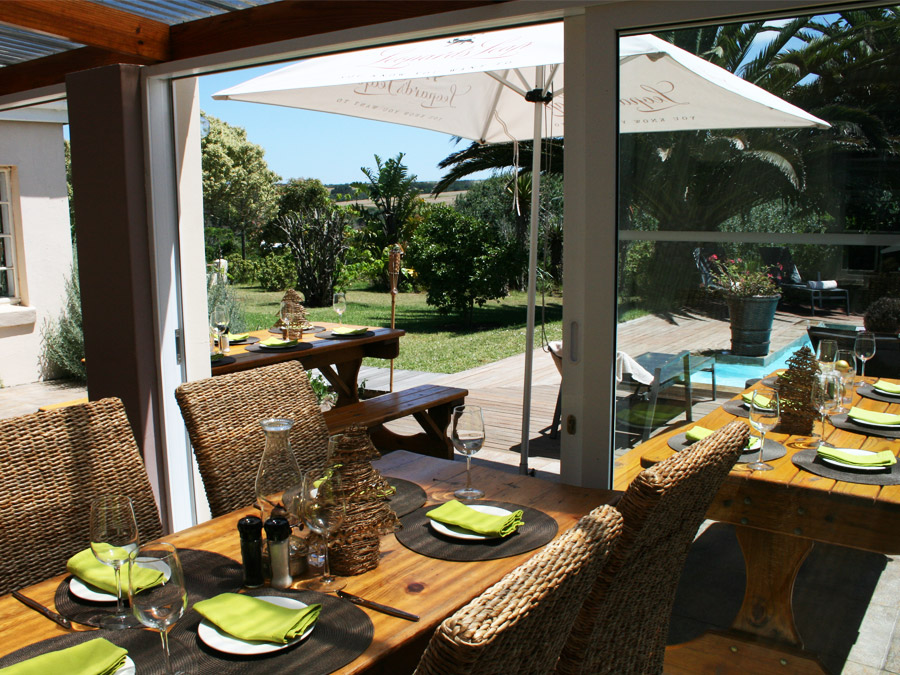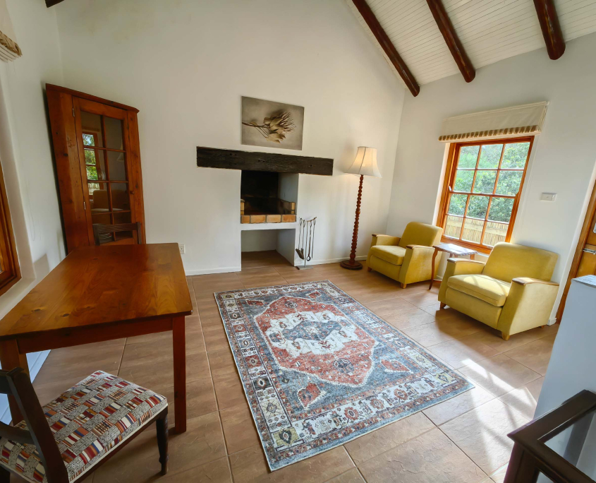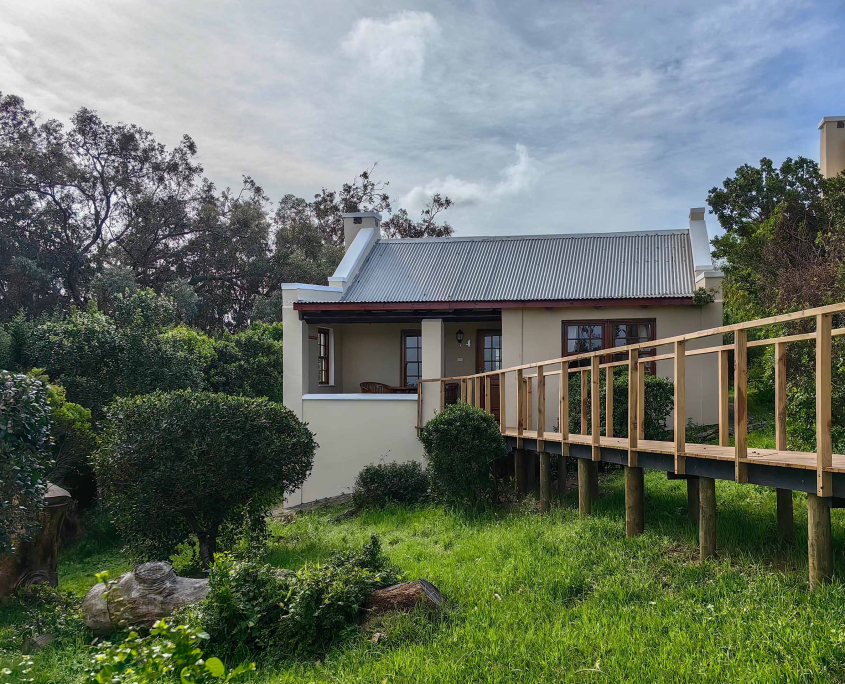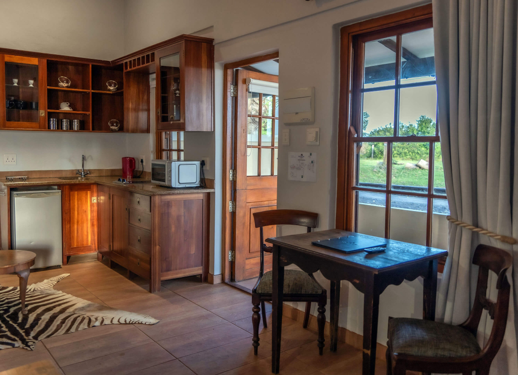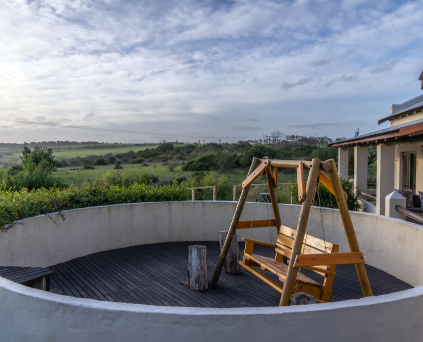 The six standard rooms are comfortable with extra length king size beds, minibar, safe & coffee/tea facilities. All have en suite bathroom with separate bath & shower. FiveΒ of these have a private veranda with distant sea view. One chalet is in the garden close to the swimming pool. None of the rooms have TV but there’s a comfortable TV lounge at the main homestead as well as a convivial bar, restaurant and swimming pool.