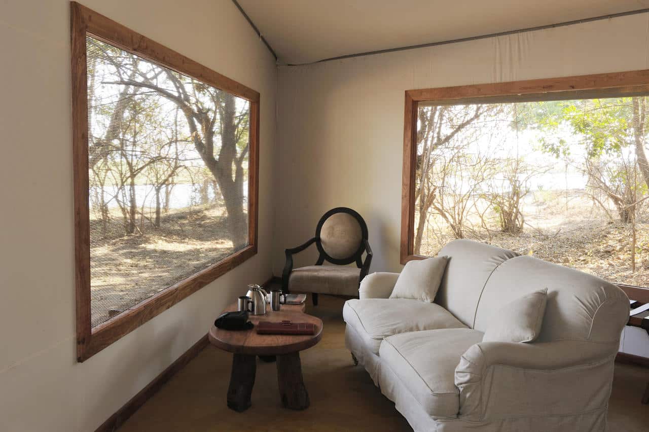 Potato Bush Camp lies in the heart of the Lower Zambezi National Park with a stunning panoramic view overlooking the Zambezi River. The camp nestles under mahogany, sausage, winterthorn and acacia trees which offer excellent shade. Potato Bush Camp comprises of three well-appointed canvas and rosewood safari tents and a massive two-bedroom family tent. There’s an open plan dining, bar and lounge area, which is accessed via raised timber boardwalks. (The raised boardwalks enable the camp to stay open until the end of the year, just before the heavy rains fromΒ January to March).